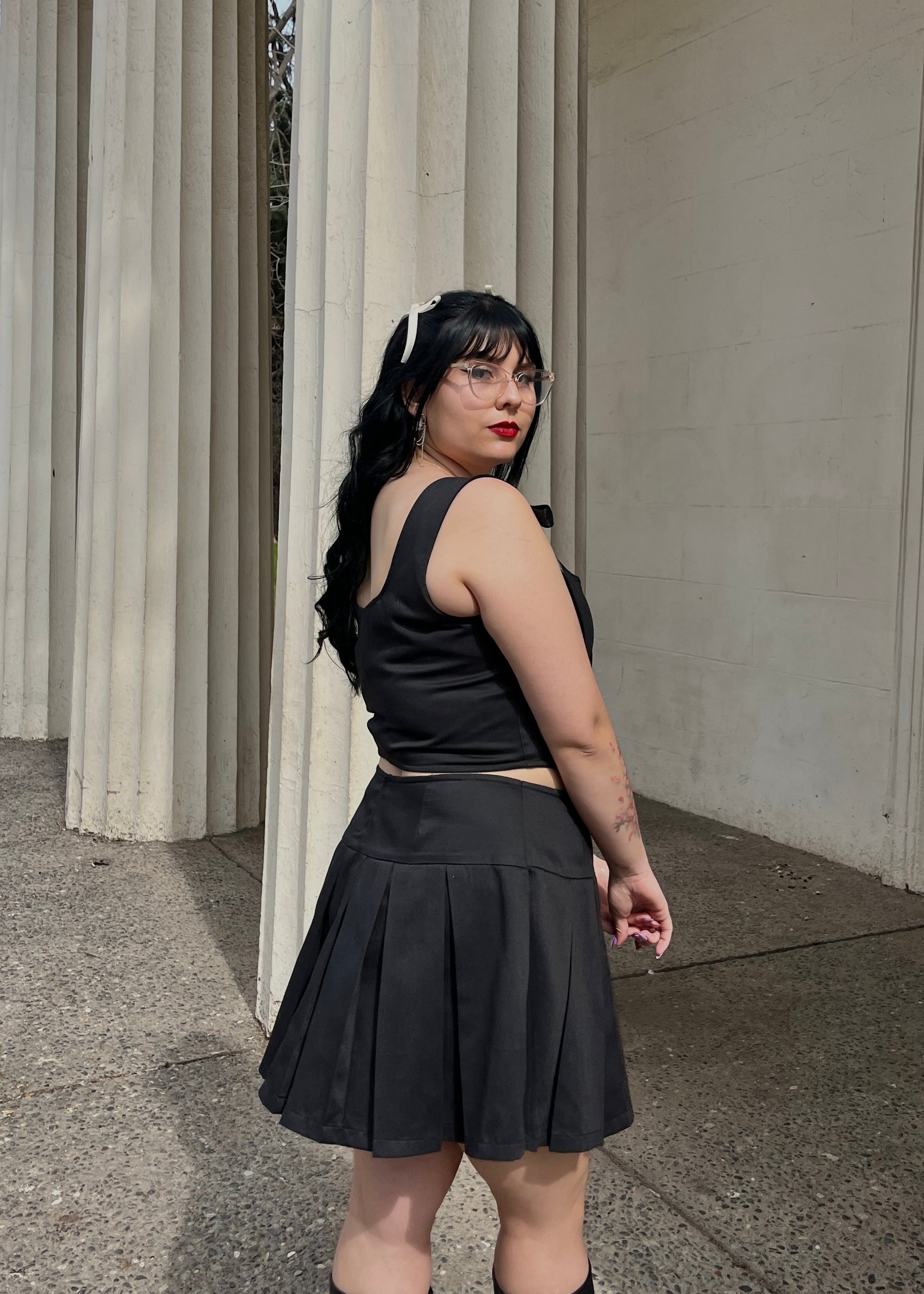 El Conjunto Aura Negro está compuesto por el corset Emily y la falda Aura. El corset posee ojetillos en su parte frontal que se unen junto con cinta negra de satin, al igual que en sus hombros. La falda tiene 7 tablas por delante y detrás.