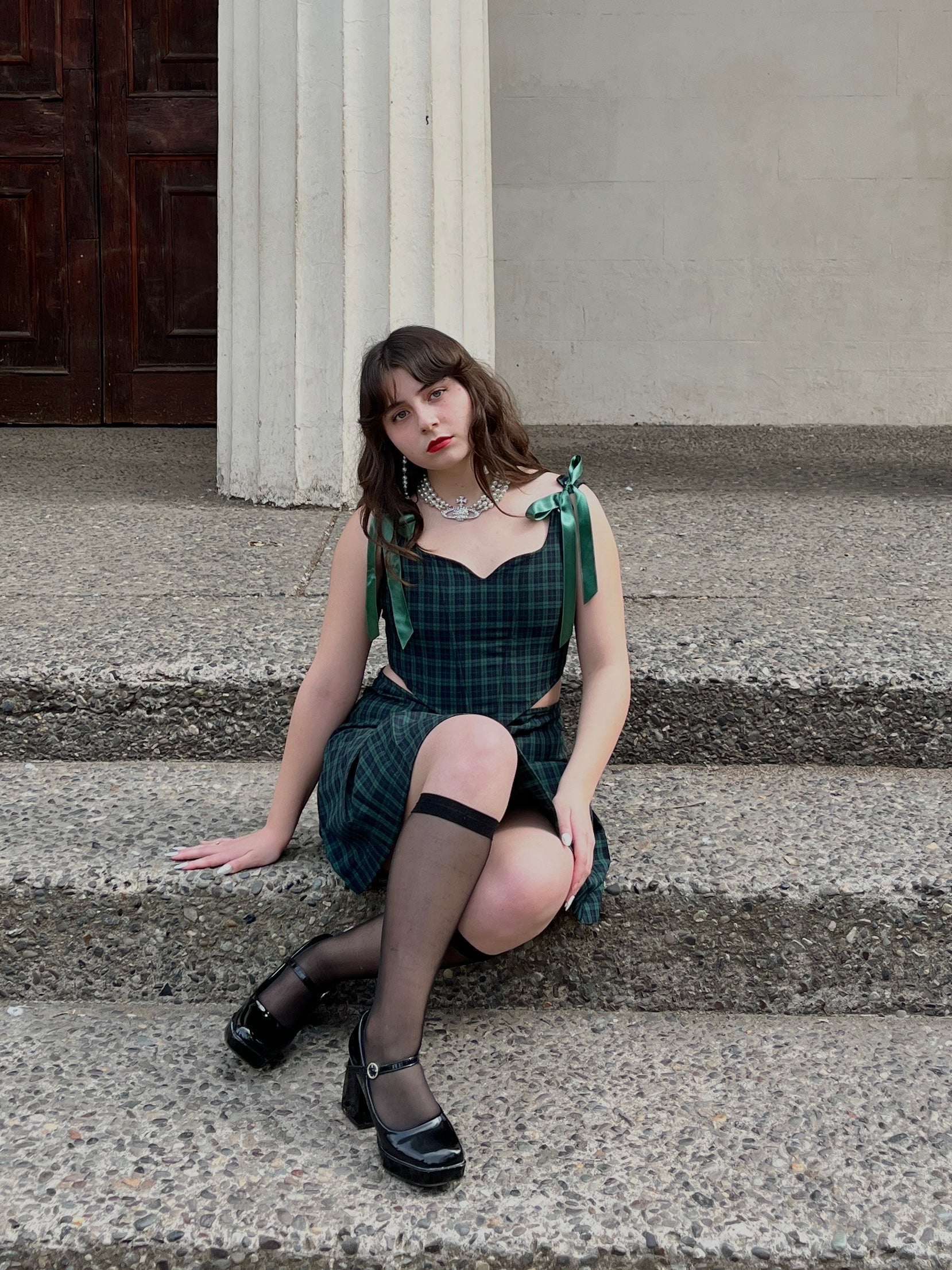 El Conjunto Azumi Cuadrillé Verde está compuesto por el corset Annika y la falda Azumi. El corset posee ojetillos en su parte trasera que se unen junto con cinta verde de satin, al igual que en sus hombros. La falda tiene 4 tablas por delante y detrás.