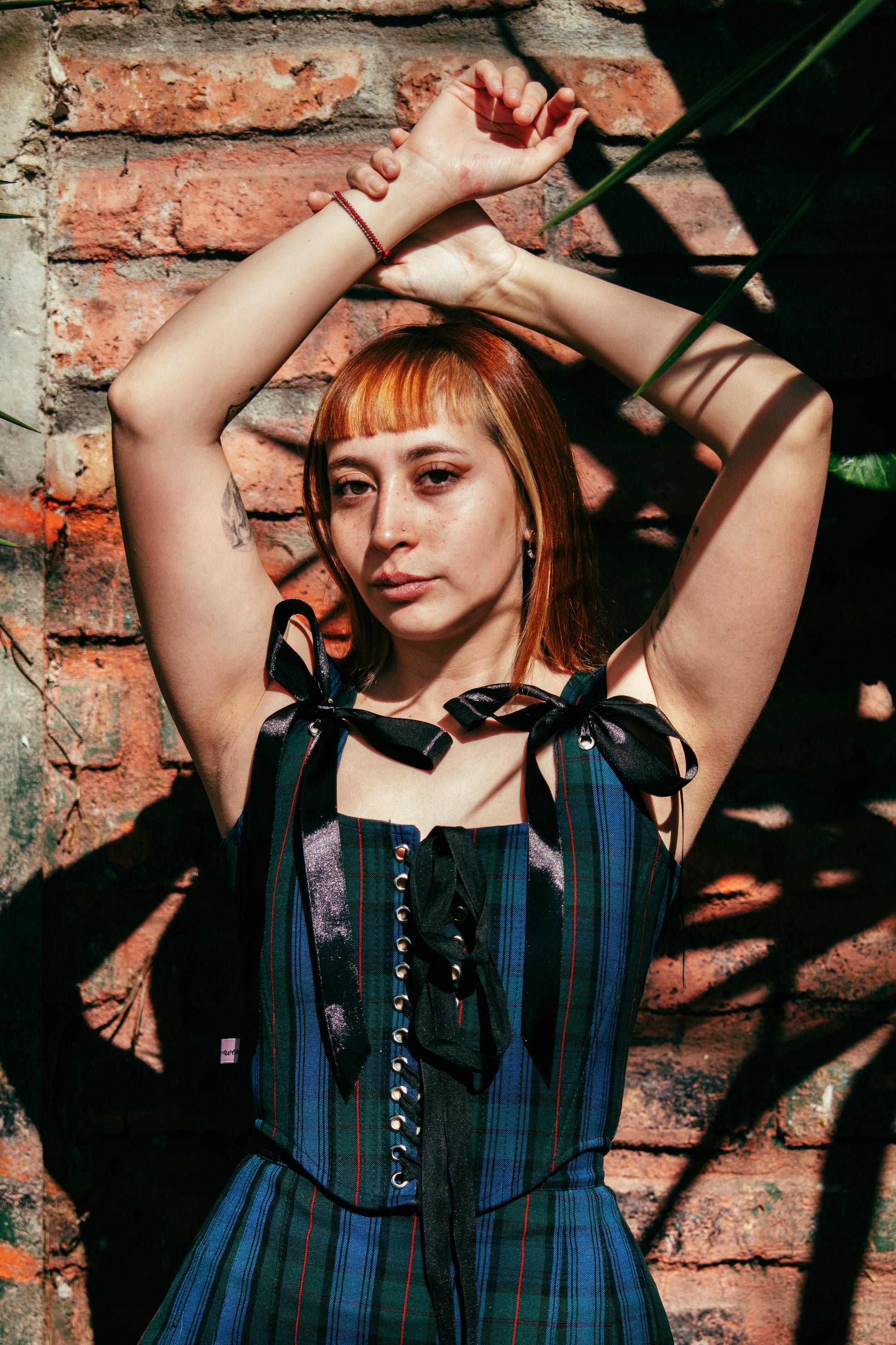 El Conjunto Melanie cuadrille azul/verde está compuesto por el corset Emily y falda Azai. El corset posee ojetillos en su parte delantera que se une con cinta negra de satin, al igual que en sus hombros. tiene 7 tablas adelante, 5 detrás y tiene aperturas en la tabla frontal del centro que esta abierta.