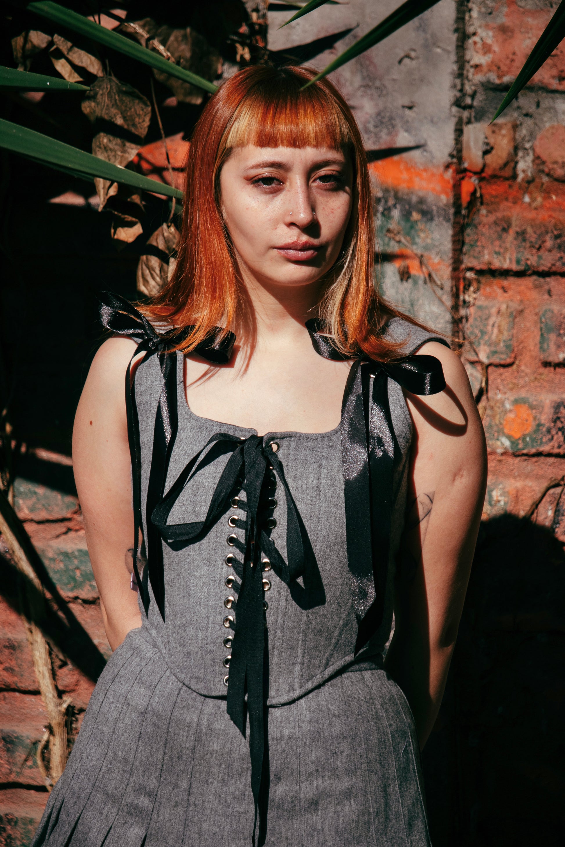 El Conjunto Renata gris está compuesto por el corset Emily y falda Renata. El corset posee ojetillos en su parte delantera que se une con cinta negra de satin, al igual que en sus hombros. tiene tablas adelante y detrás.