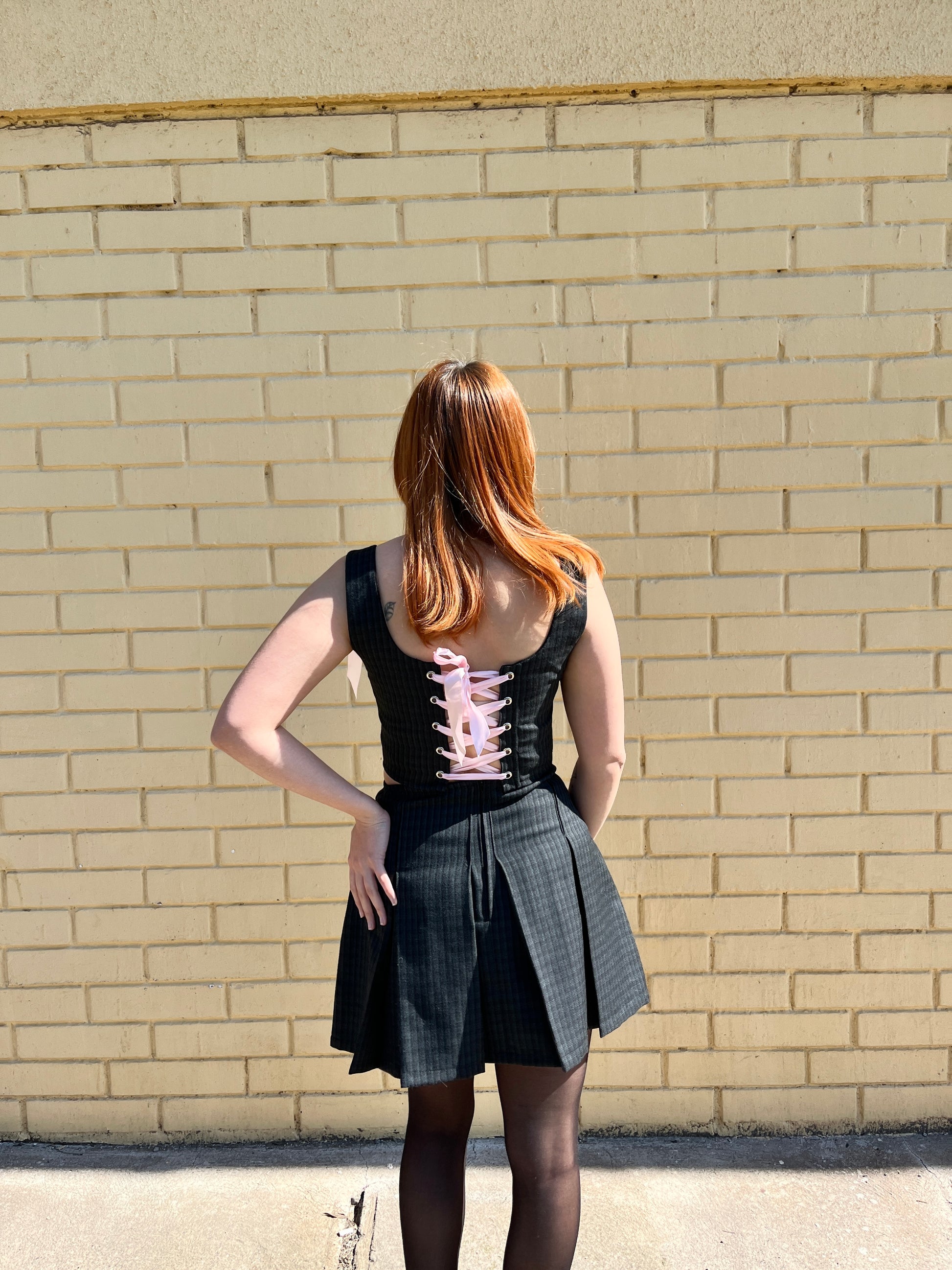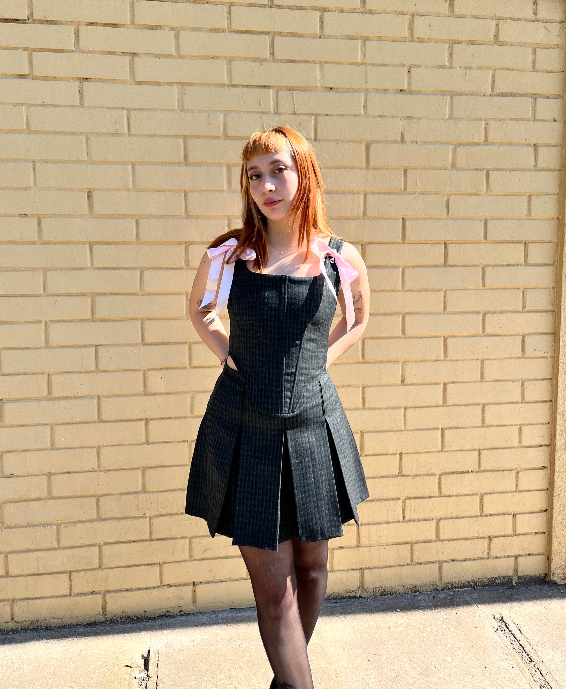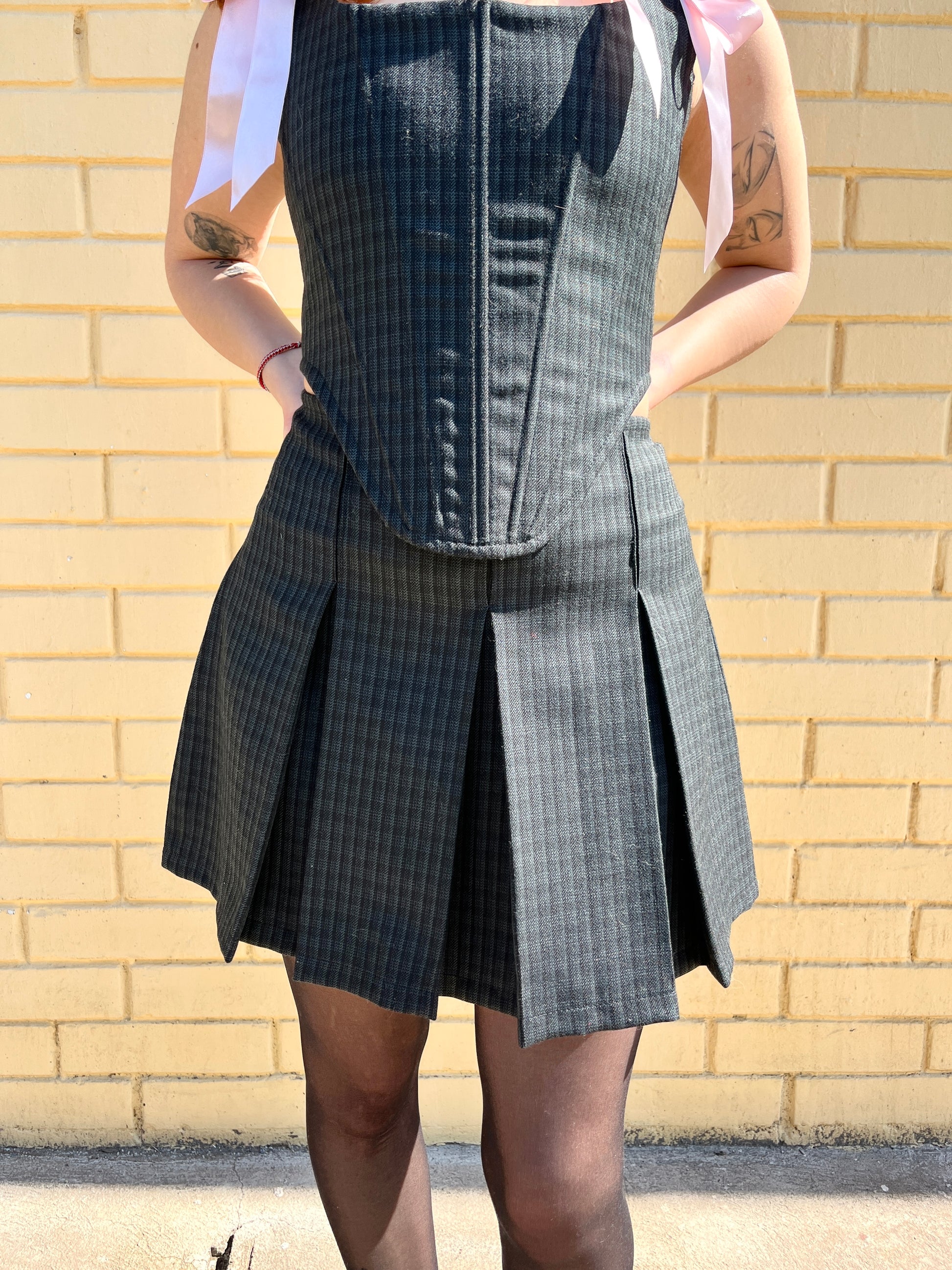 El Conjunto Sofia Cuadrillé Grafito está compuesto por el corset Annika y la falda Azumi. El corset posee ojetillos en su parte trasera que se unen junto con cinta rosa de satin, al igual que en sus hombros. La falda tiene 4 tablas por delante y detrás.
