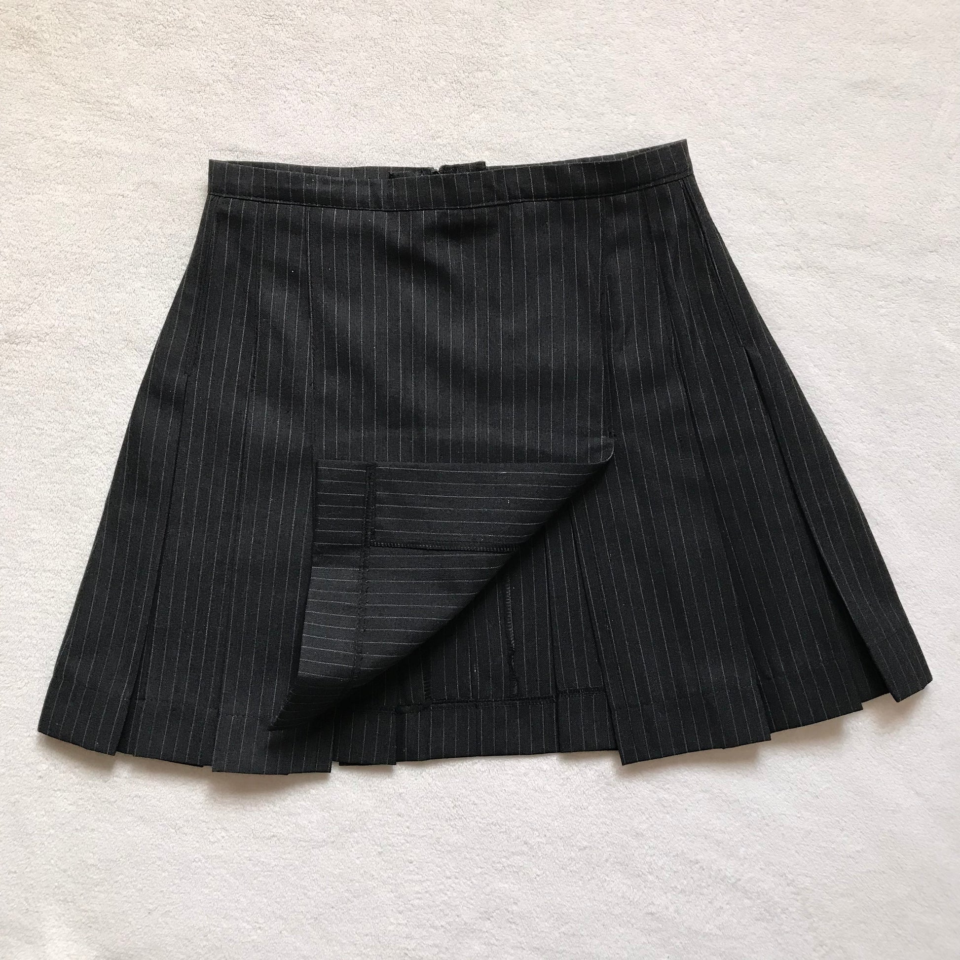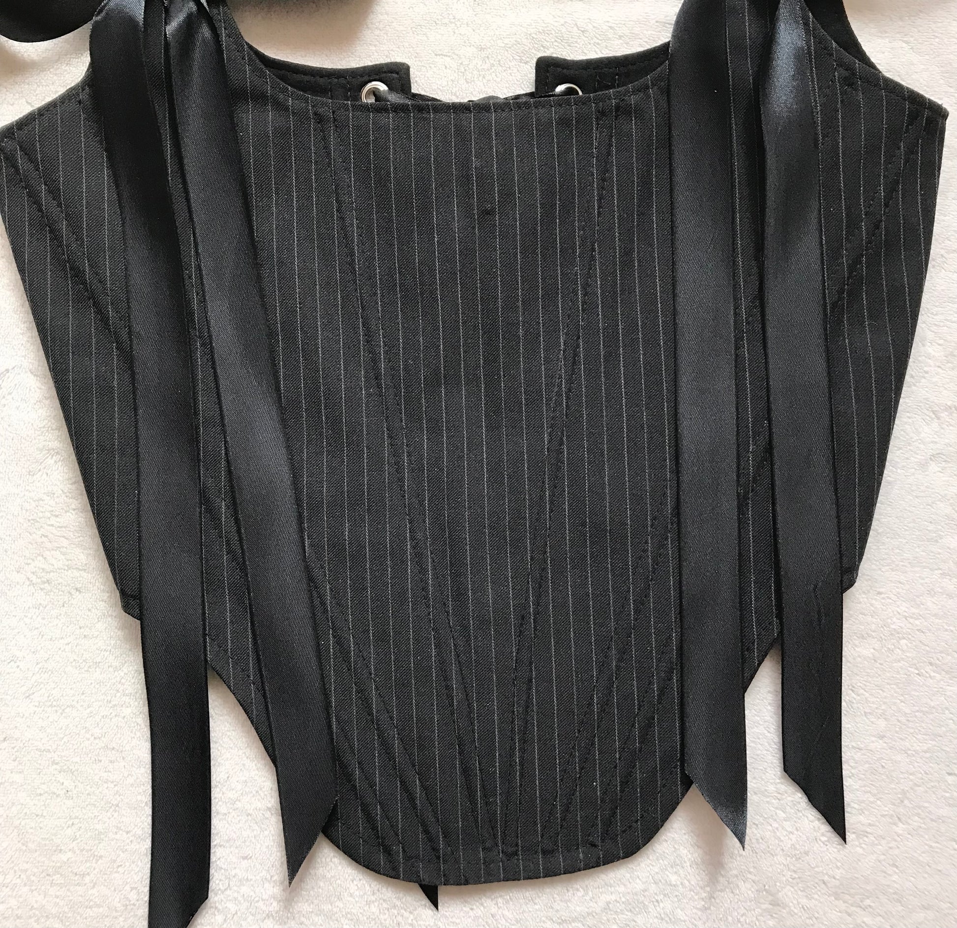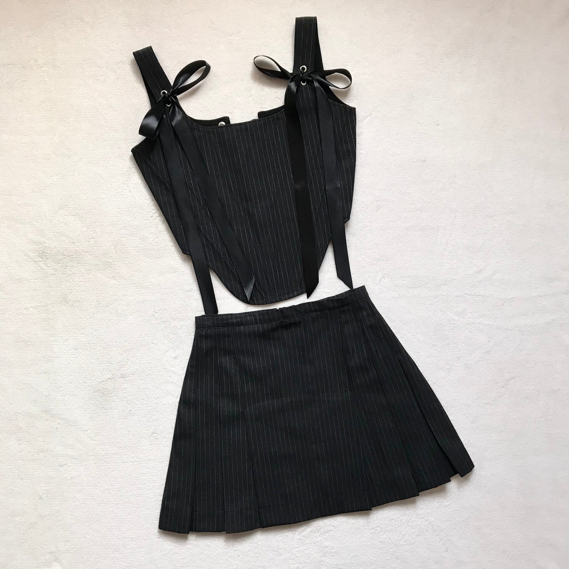 El Conjunto Sophia marengo listado está compuesto por el corset Luna y la falda Azai. El corset posee ojetillos en su parte trasera que se unen junto con cinta negra de satin, al igual que en sus hombros. La tiene 4 tablas por delante, 5 detrás y tiene aperturas en la tabla frontal del centro.