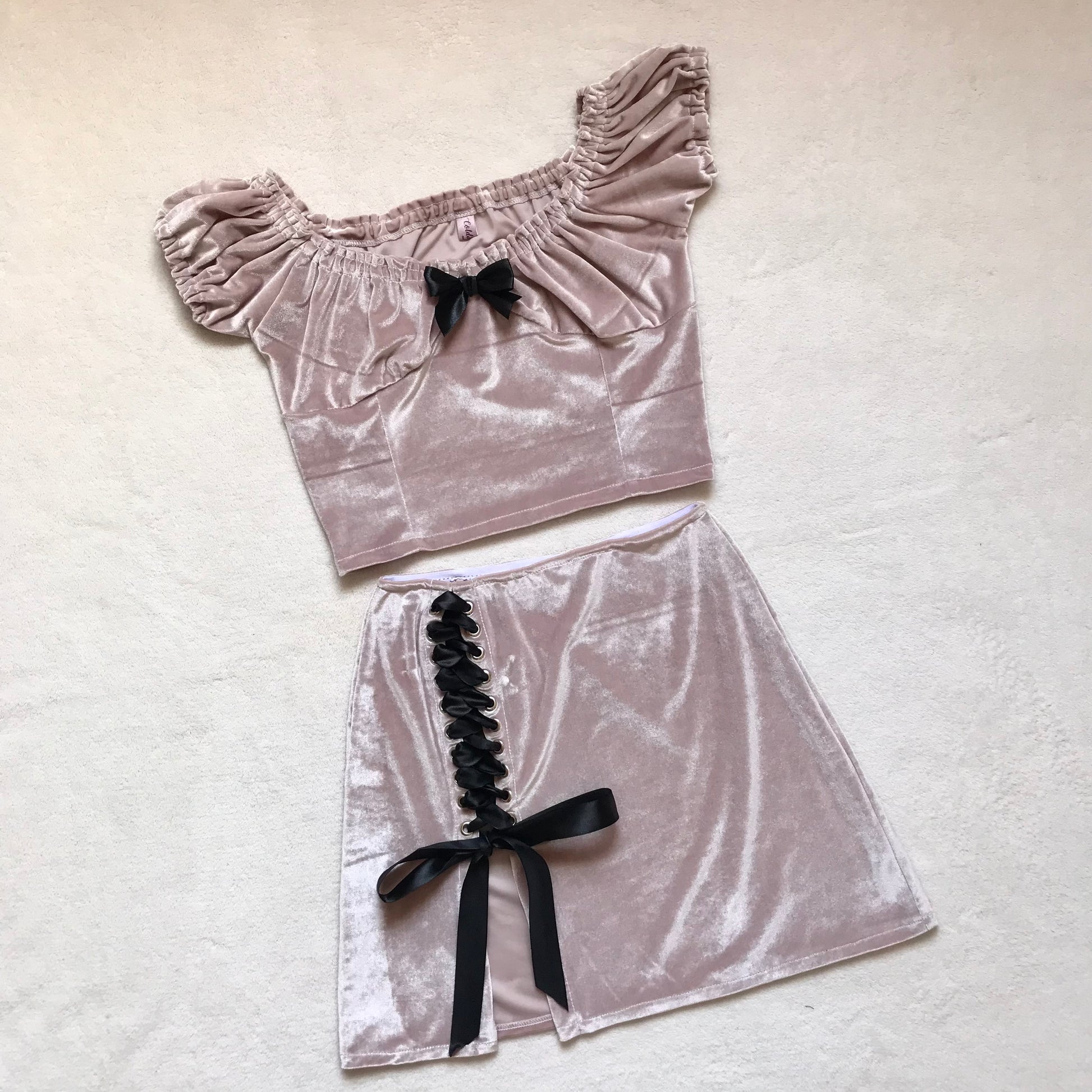 El Conjunto Twice Crop Rosa. está compuesto por el crop Twice y la falda Twice. El crop tiene corte en el busto y un lazo negro de satin. La falda tiene apertura al costado de la pierna y cinta negra de satin.