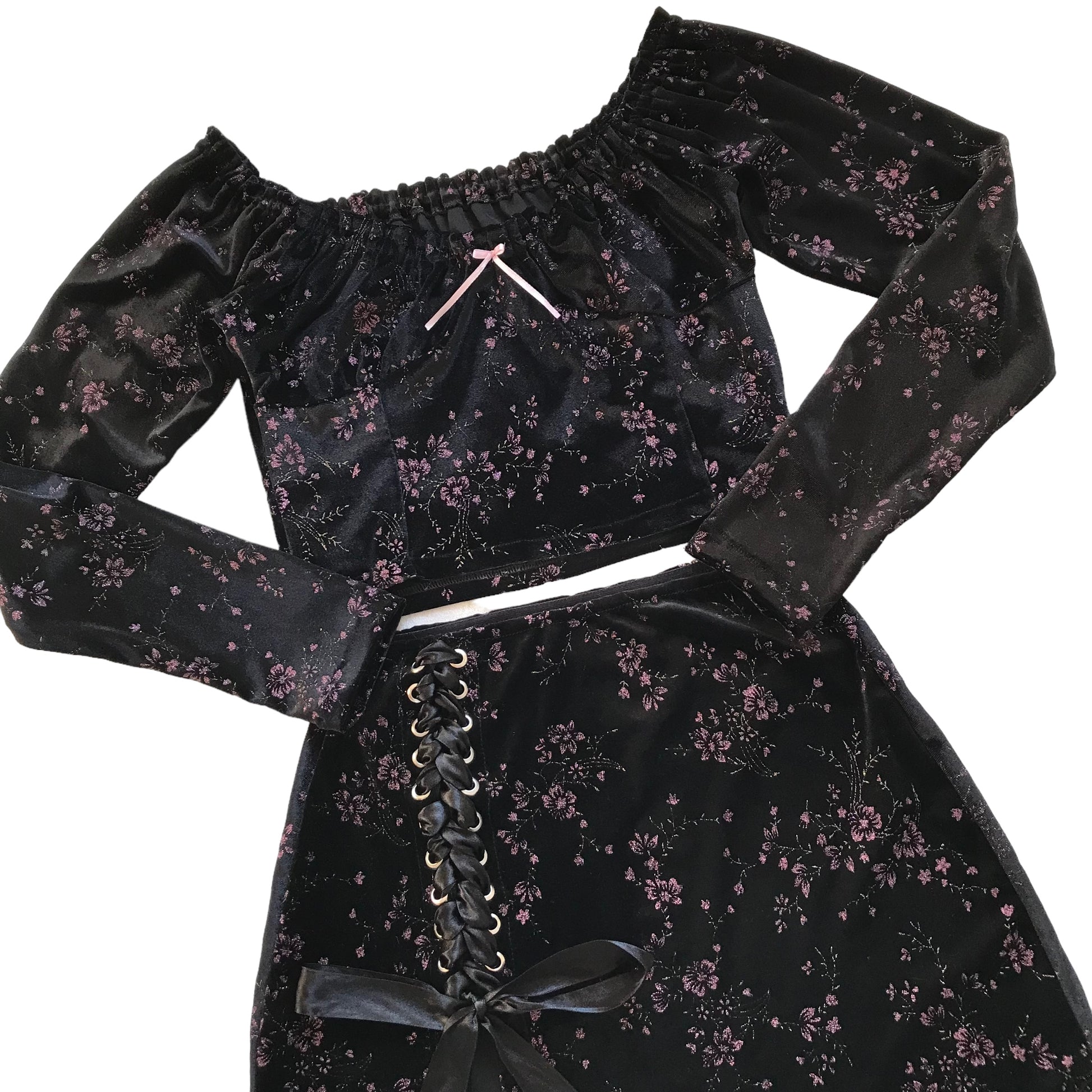 El Conjunto Twice Crop Negro Flores Brillos está compuesto por el crop Twice manga larga y la falda Twice. El crop tiene corte en el busto y un lazo rosa de satin. La falda tiene apertura al costado de la pierna y cinta negra de satin.