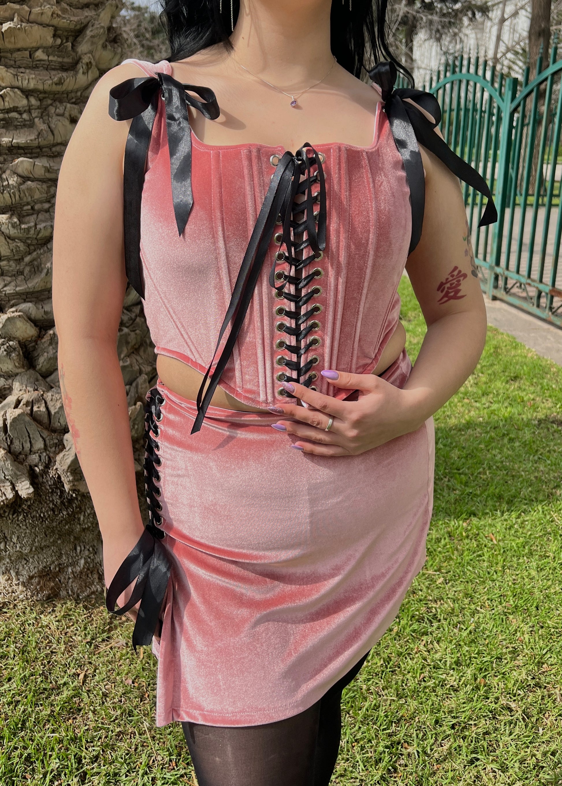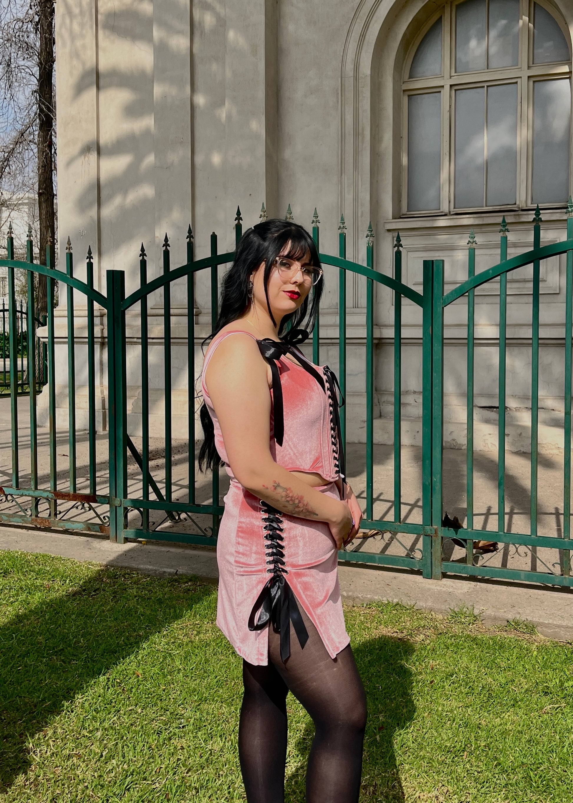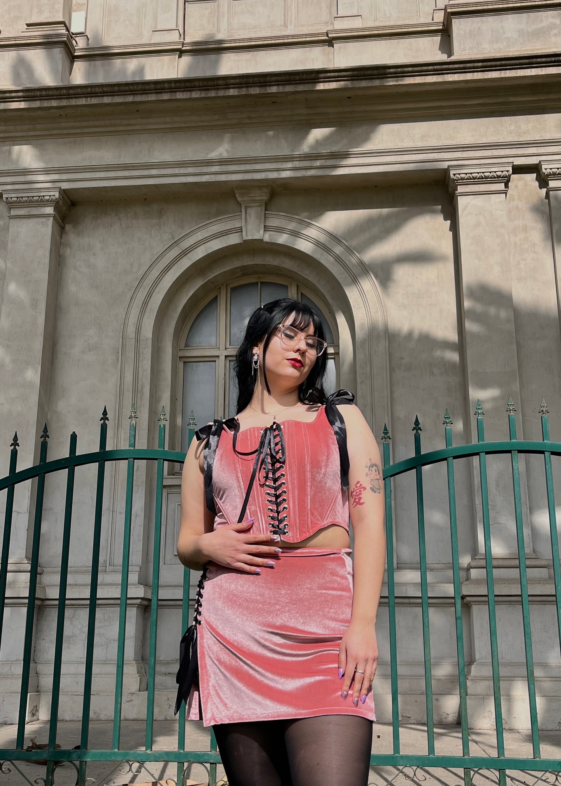 El Conjunto Twice Rosa está compuesto por el corset Emily y la falda Twice. El corset posee ojetillos en su parte frontal que se unen junto con cinta negra de satin, al igual que en sus hombros. La falda tiene apertura al costado de la pierna y cinta negra de satin.