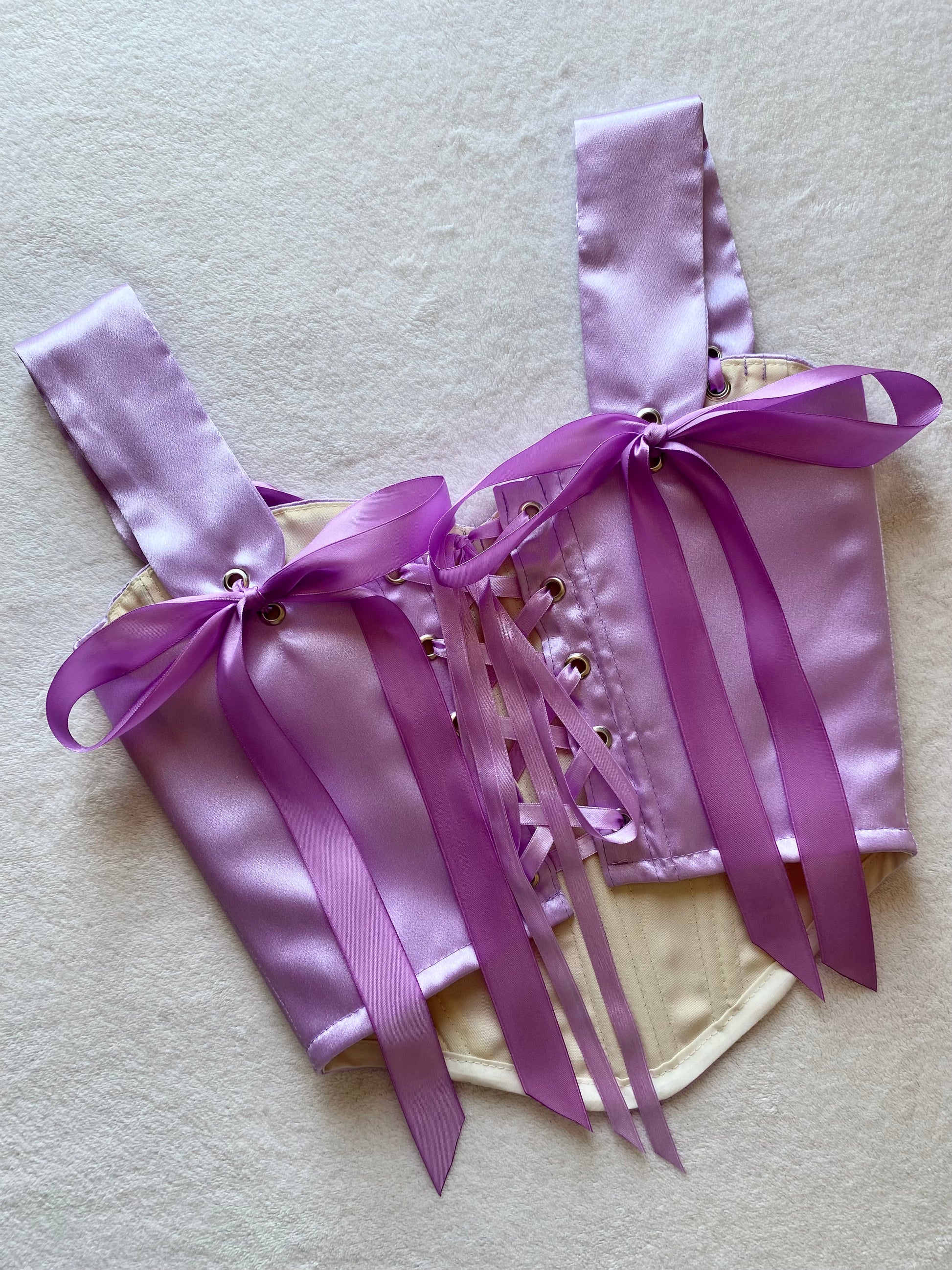 El Corset 2 en 1 tirantes se desmontan para quedar strapless posee ojetillos en su parte de espalda que se unen junto con cinta lila de satin, al igual que en sus hombros.
