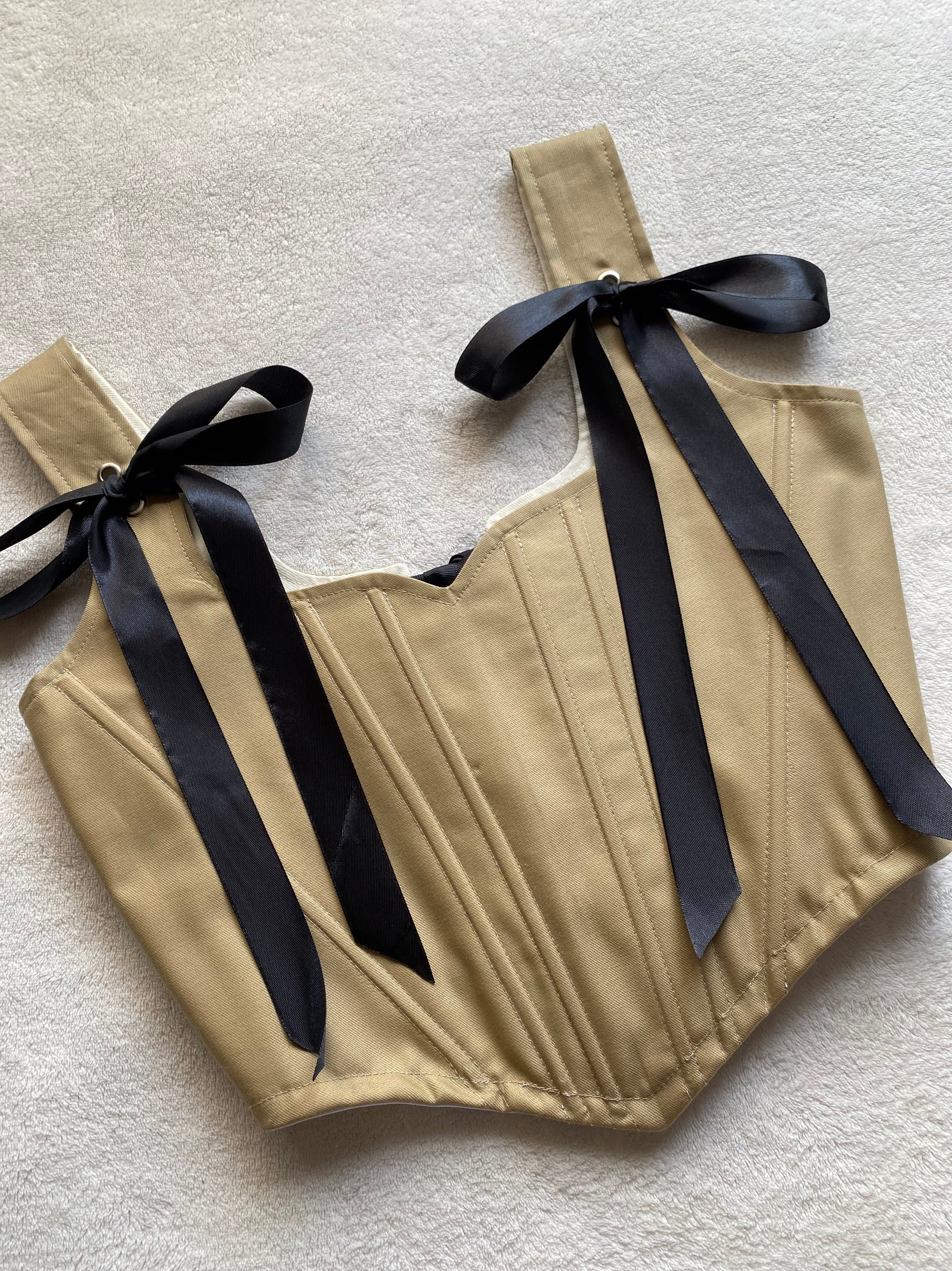 El Corset Azumi Café Manjar posee ojetillos en su parte trasera que se unen junto con cinta negra de satin, al igual que en sus hombros.