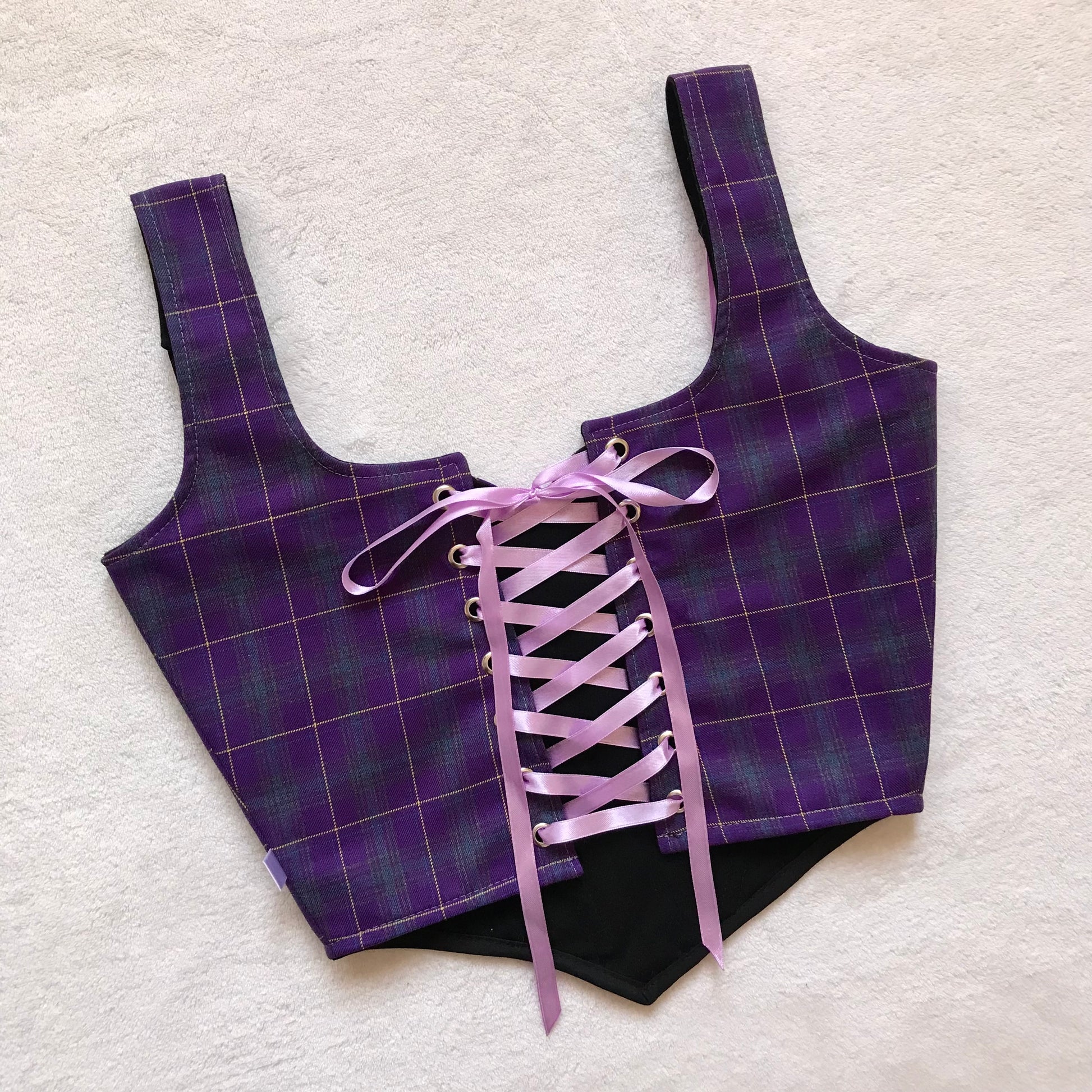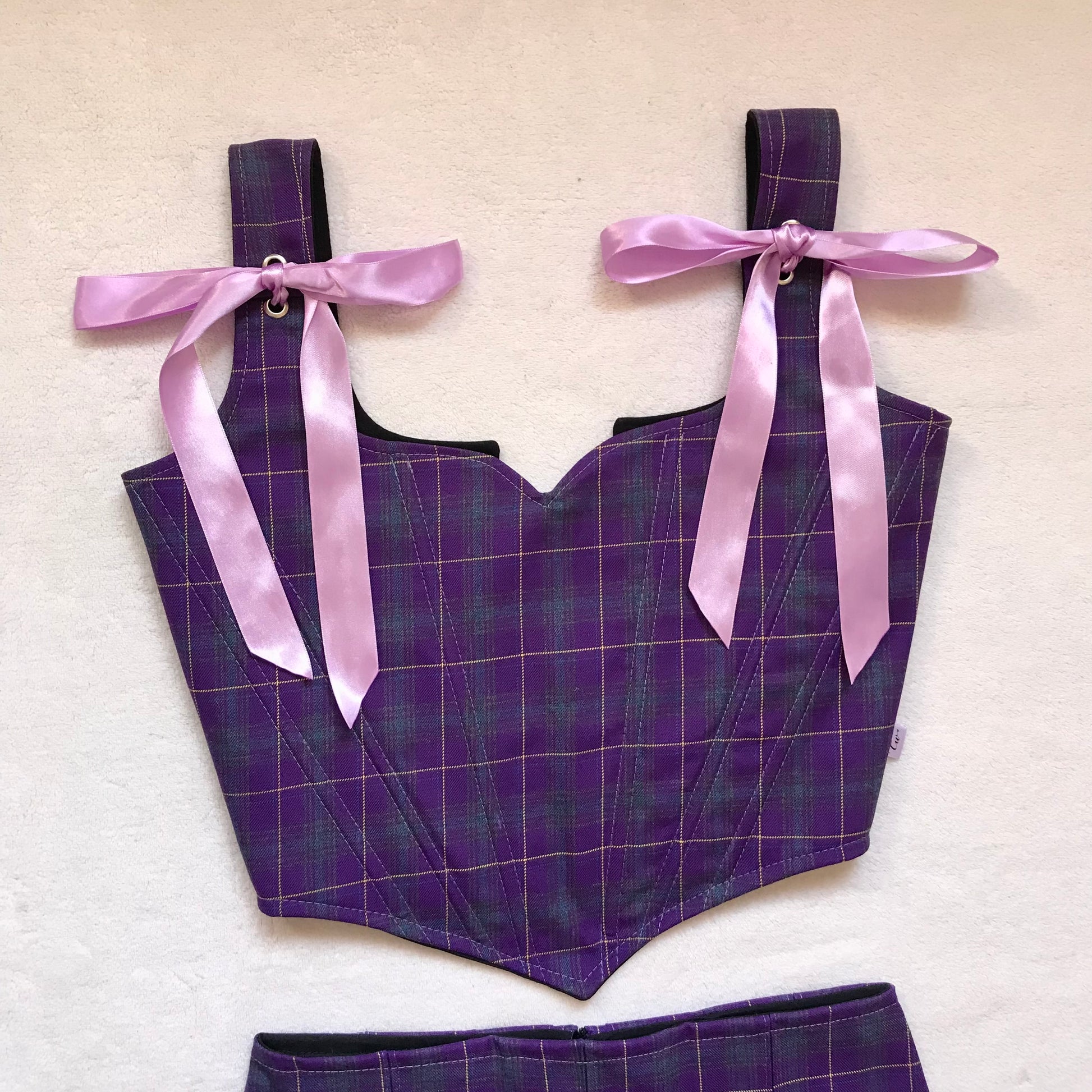 El Corset Azumi Cuadrillé Morado posee ojetillos en su parte trasera que se unen junto con cinta lila de satin, al igual que en sus hombros.
