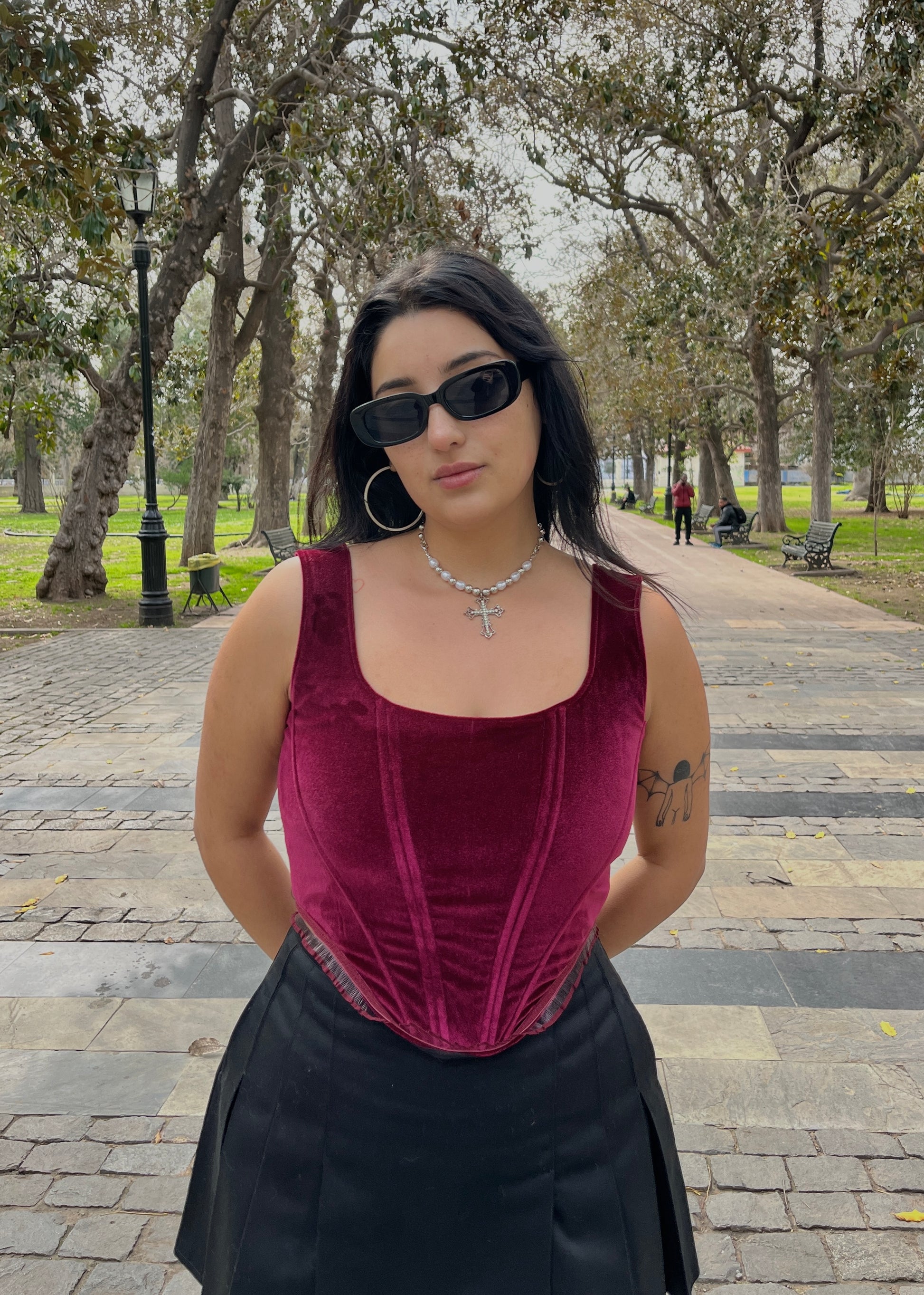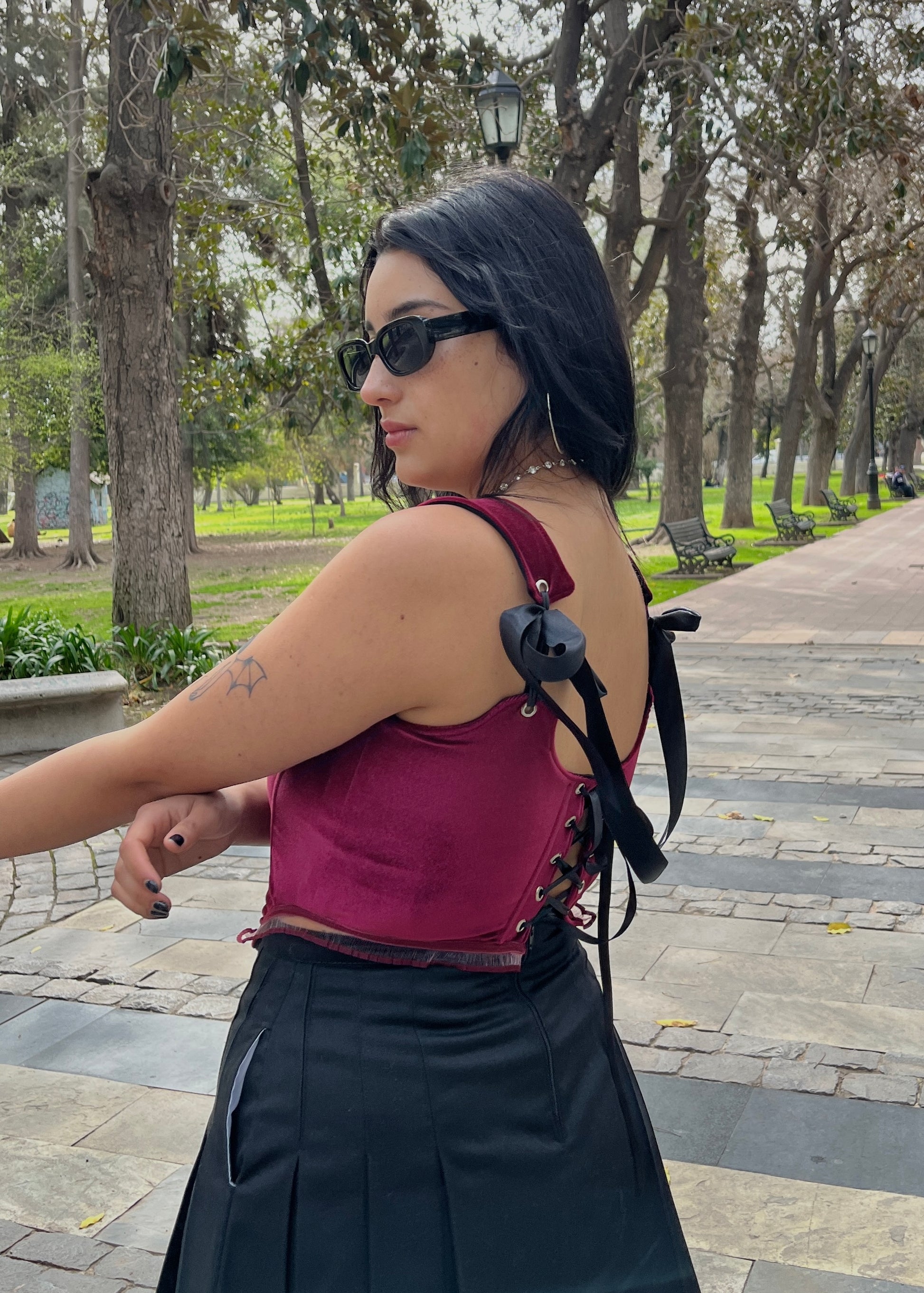 El Corset Jade Burdeo Encaje posee ojetillos en su parte trasera que se unen junto con cinta negra de satin, al igual que en sus hombros.
