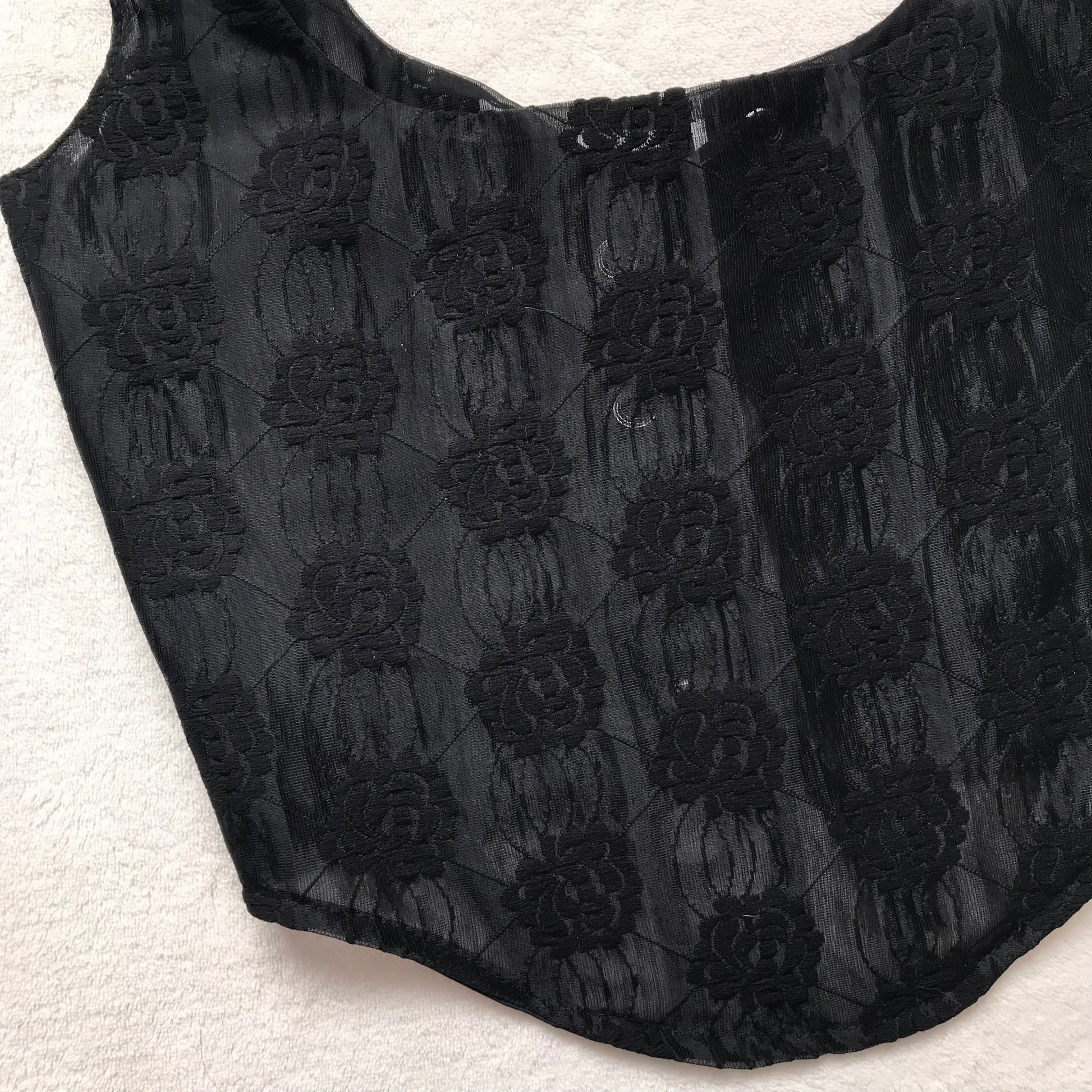 El Corset Jade Encaje posee ojetillos en su parte de espalda que se unen con cinta negra de satin. tirante unido.