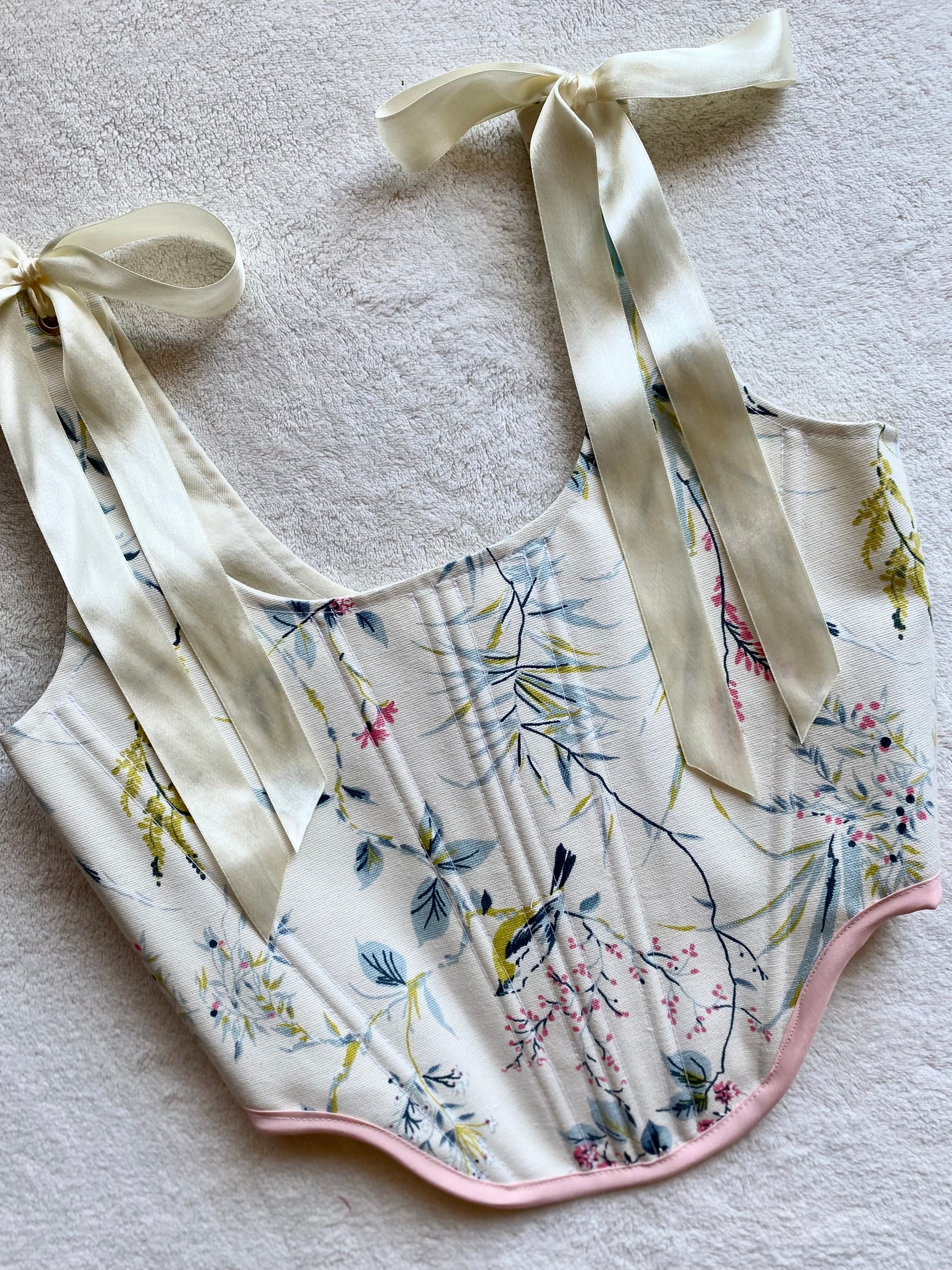 El Corset Jade Crudo con Flores y Pajaritos posee ojetillos en su parte de espalda que se unen junto con cinta crudo de satin, al igual que en sus hombros, tiene sesgo rosa como terminación.