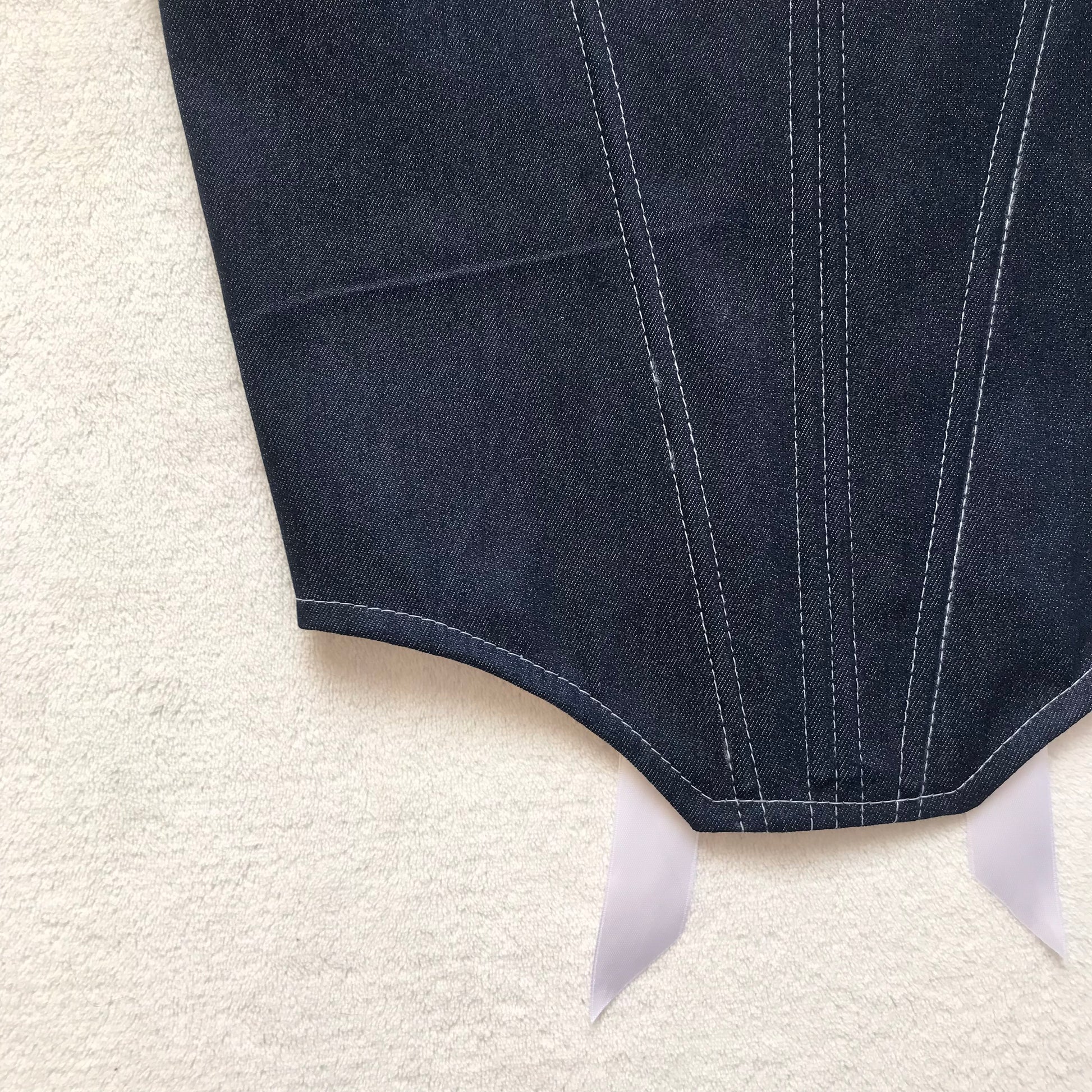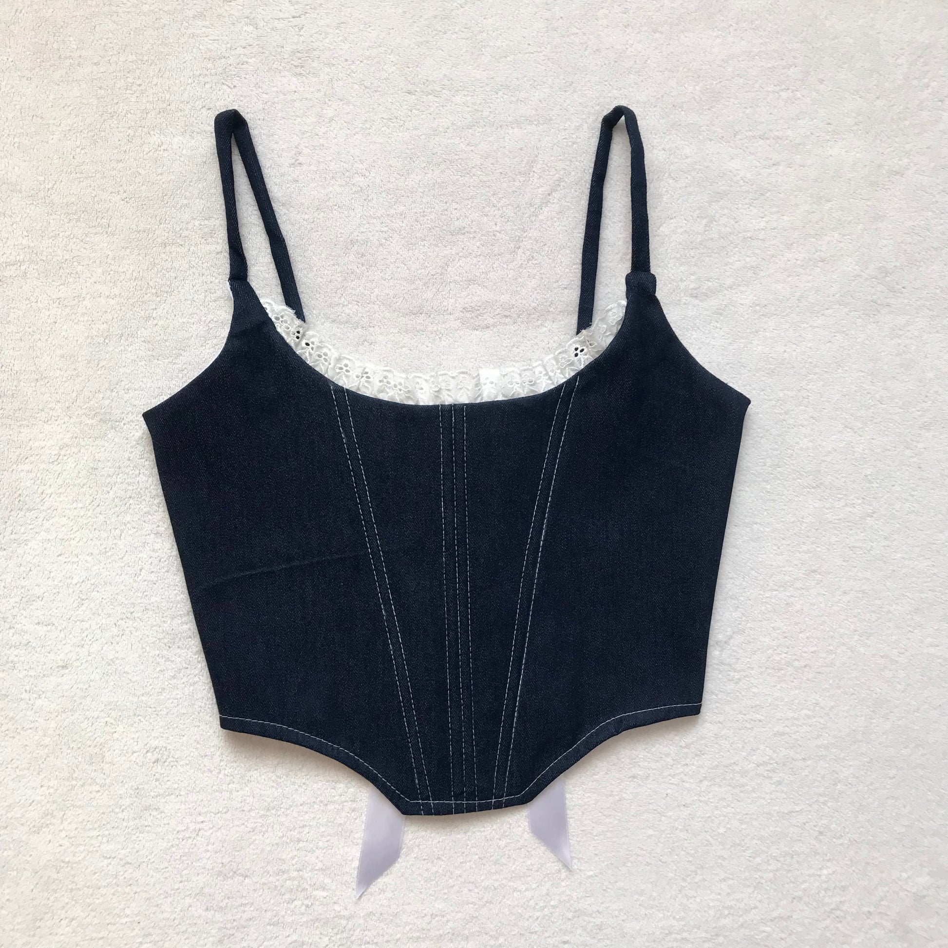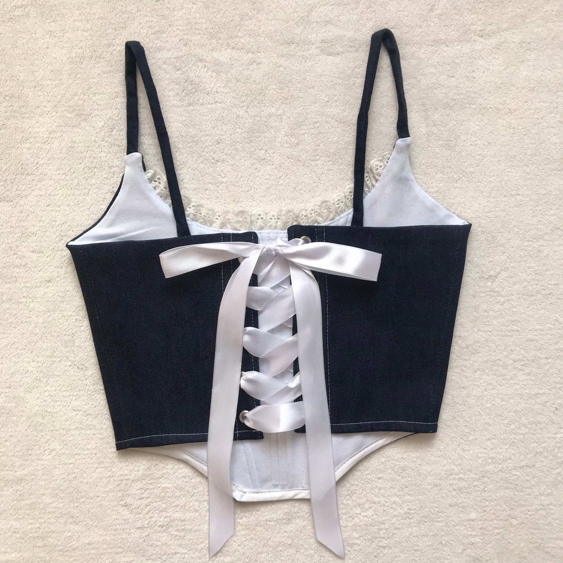 El Corset Norma Azul. posee ojetillos en su parte de espalda que se unen con cinta Blanca de satin, lleva detalle broderie en el busto, tirante unido.