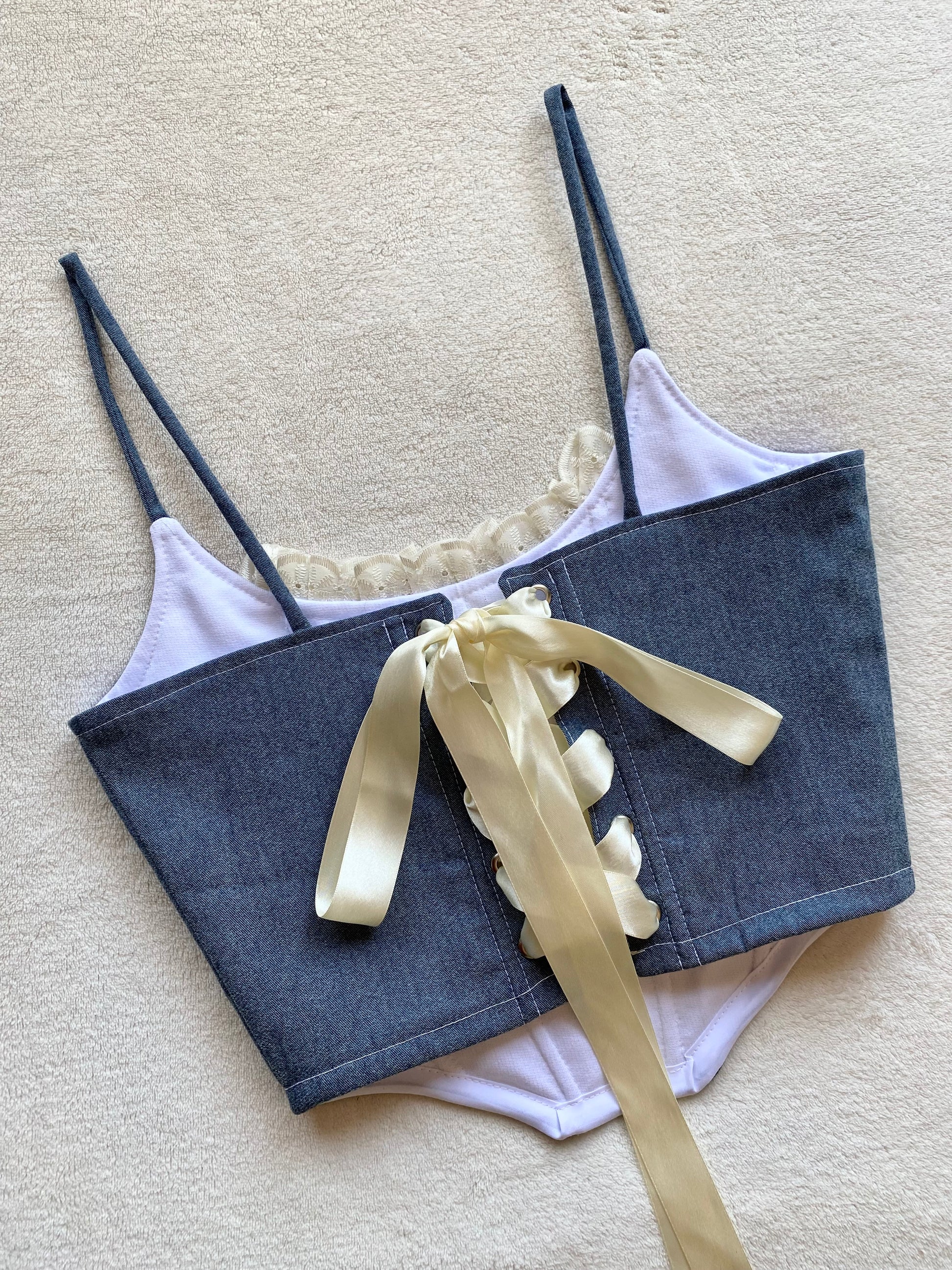 El Corset Norma Celeste. posee ojetillos en su parte de espalda que se unen con cinta Beige de satin, lleva detalle broderie en el busto, tirante unido.