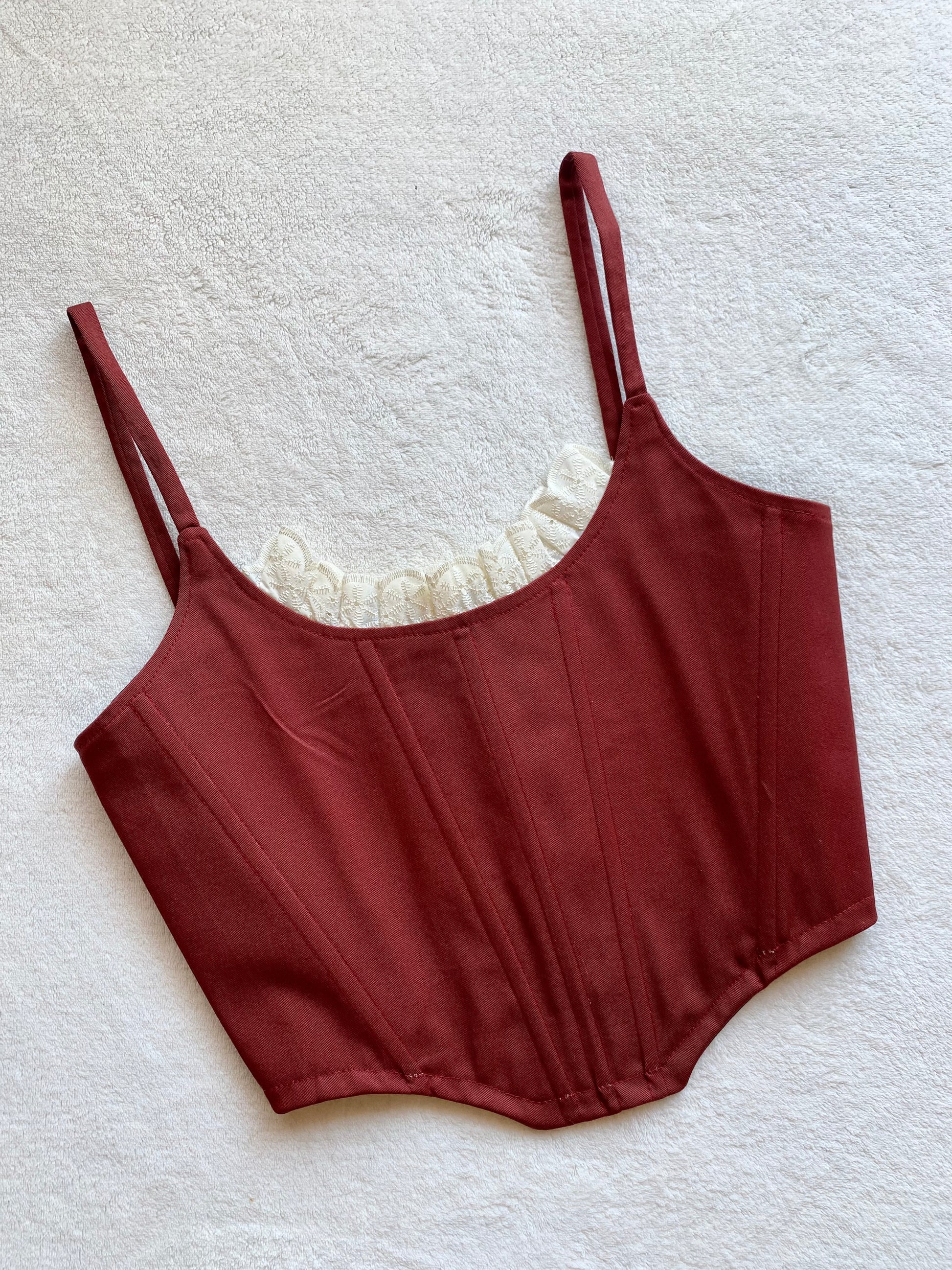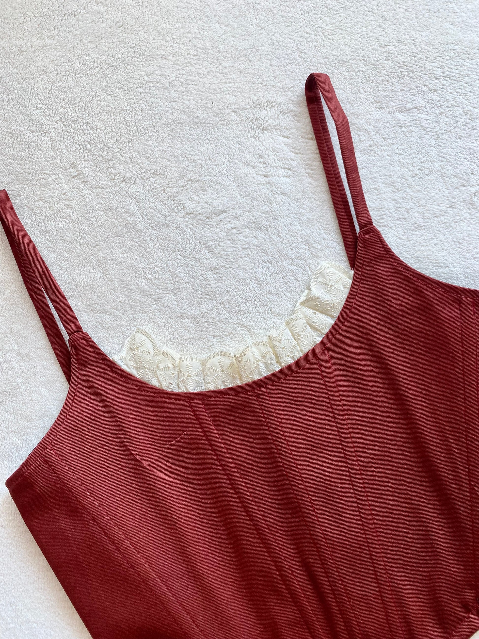El Corset Norma Ladrillo. posee ojetillos en su parte de espalda que se unen con cinta Beige de satin, lleva detalle broderie en el busto, tirante unido.