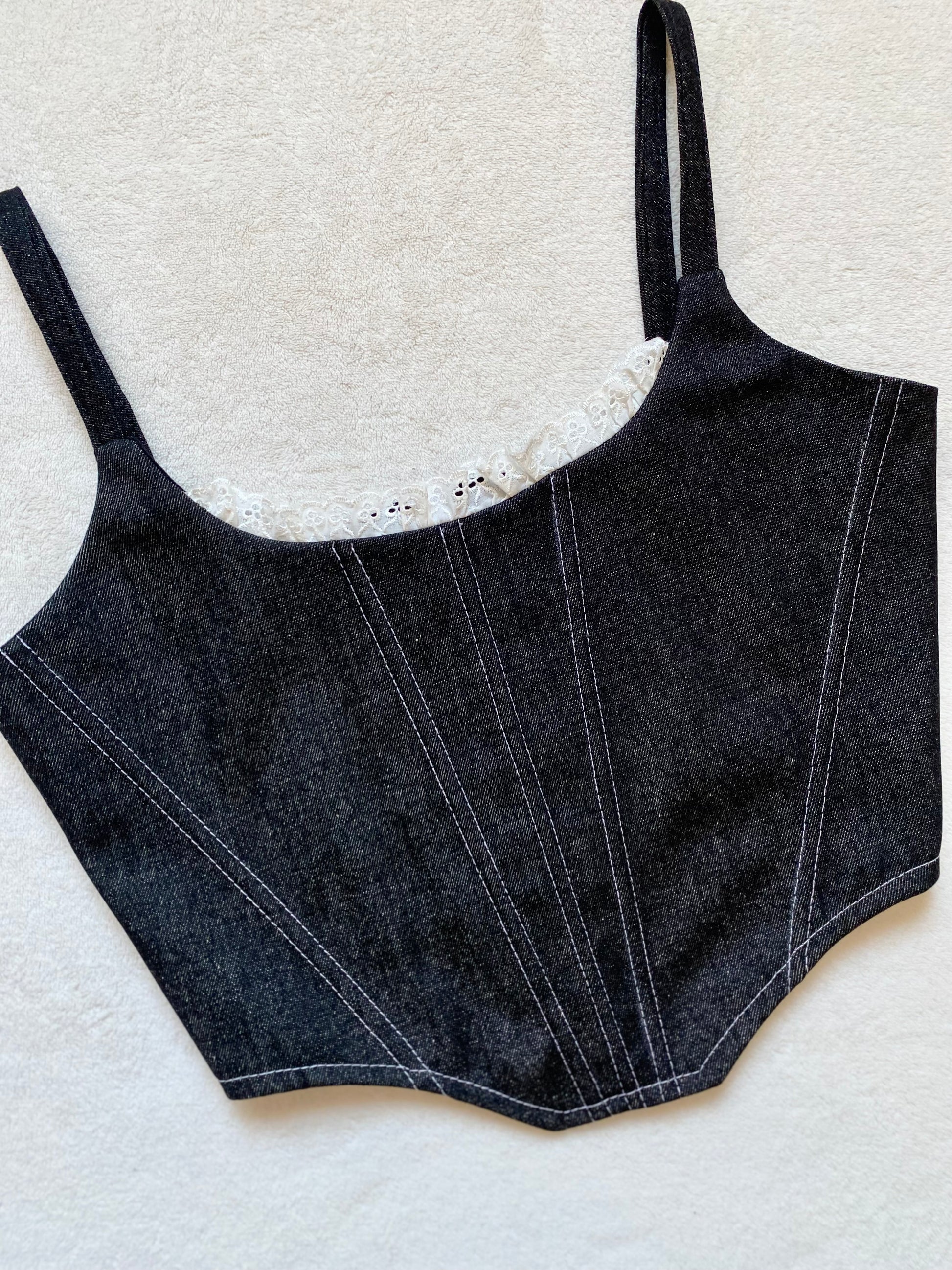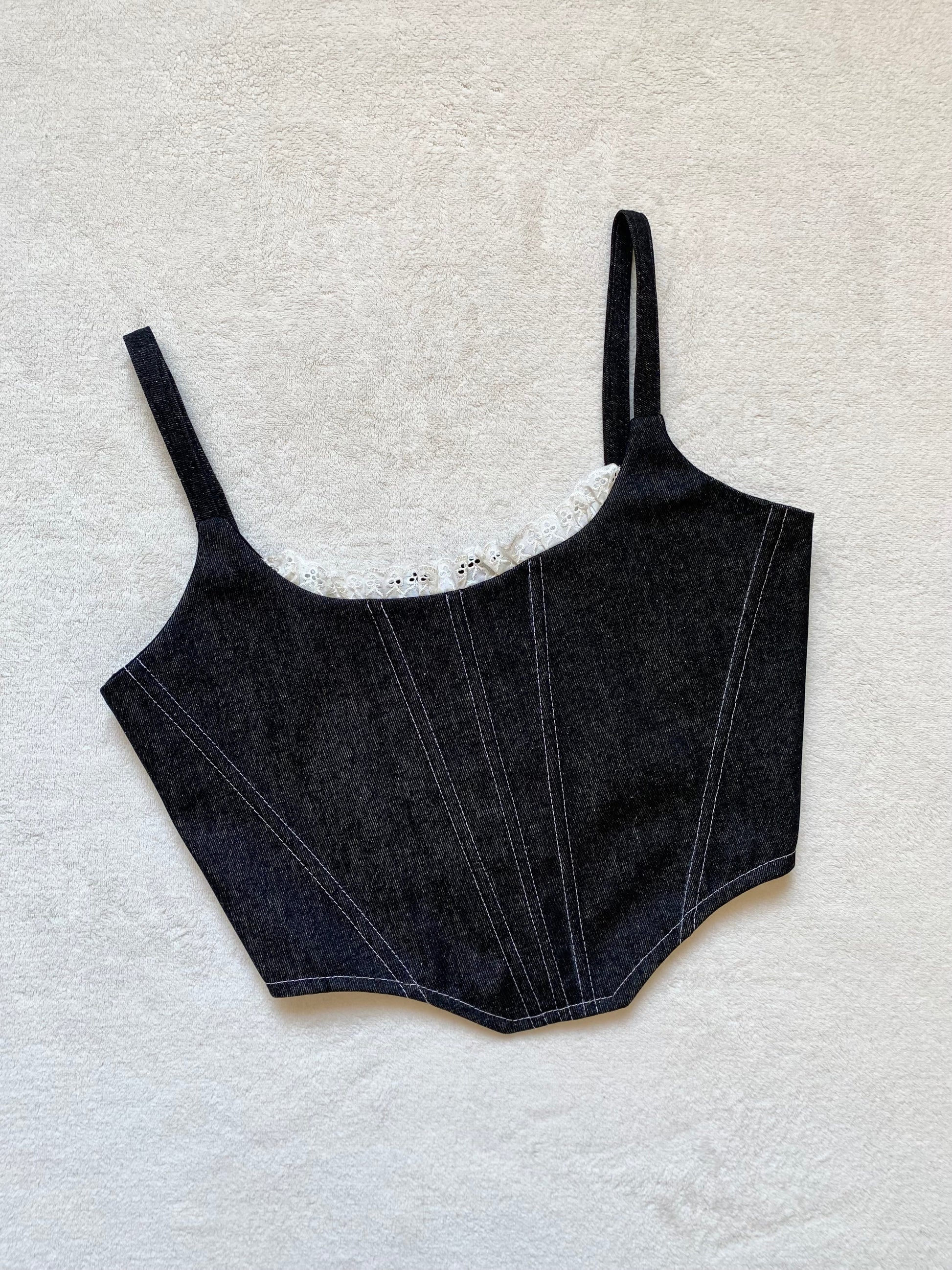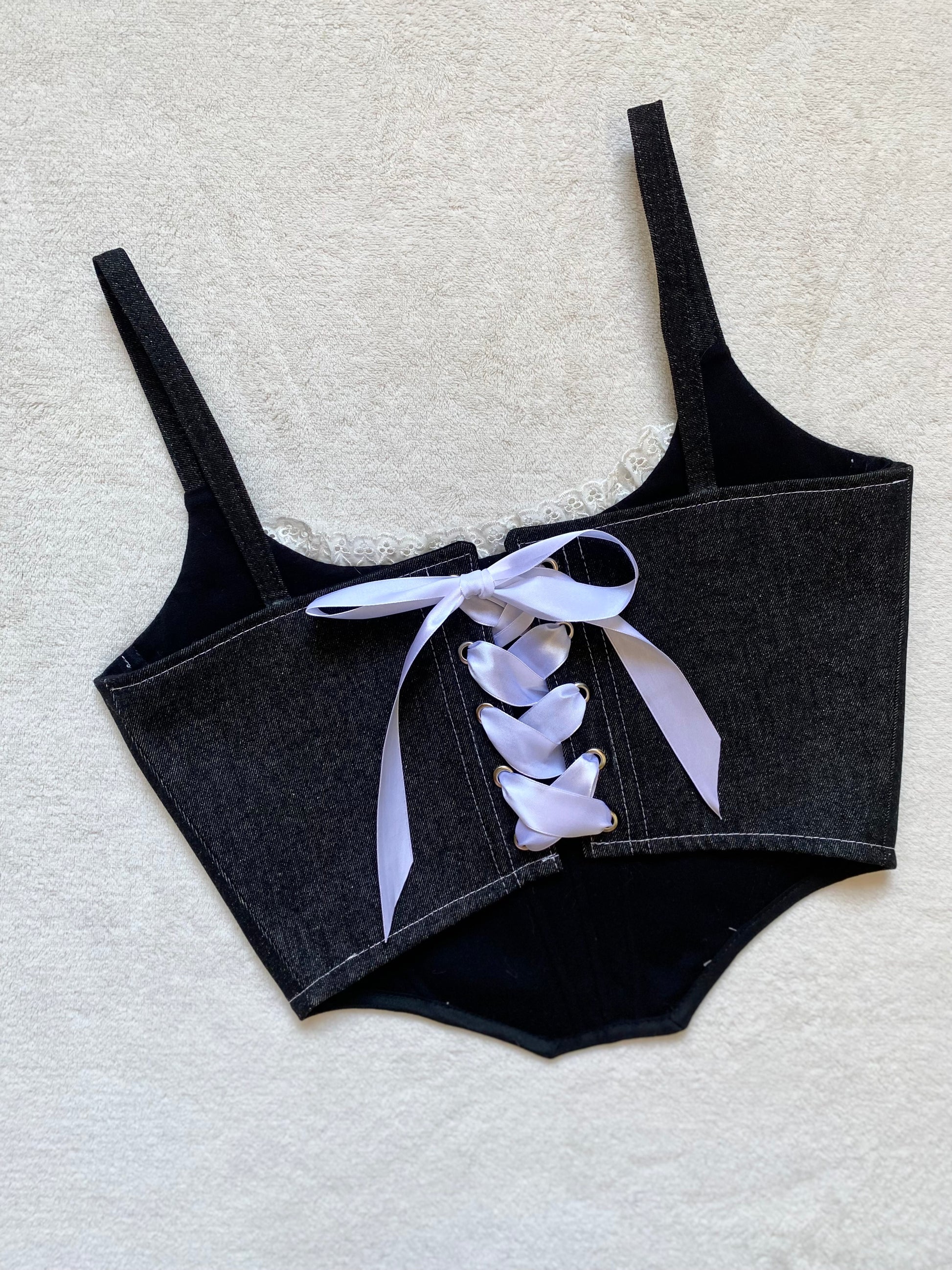 El Corset Norma Negro posee ojetillos en su parte de espalda que se unen con cinta Beige de satin, lleva detalle broderie en el busto, tirante unido.
