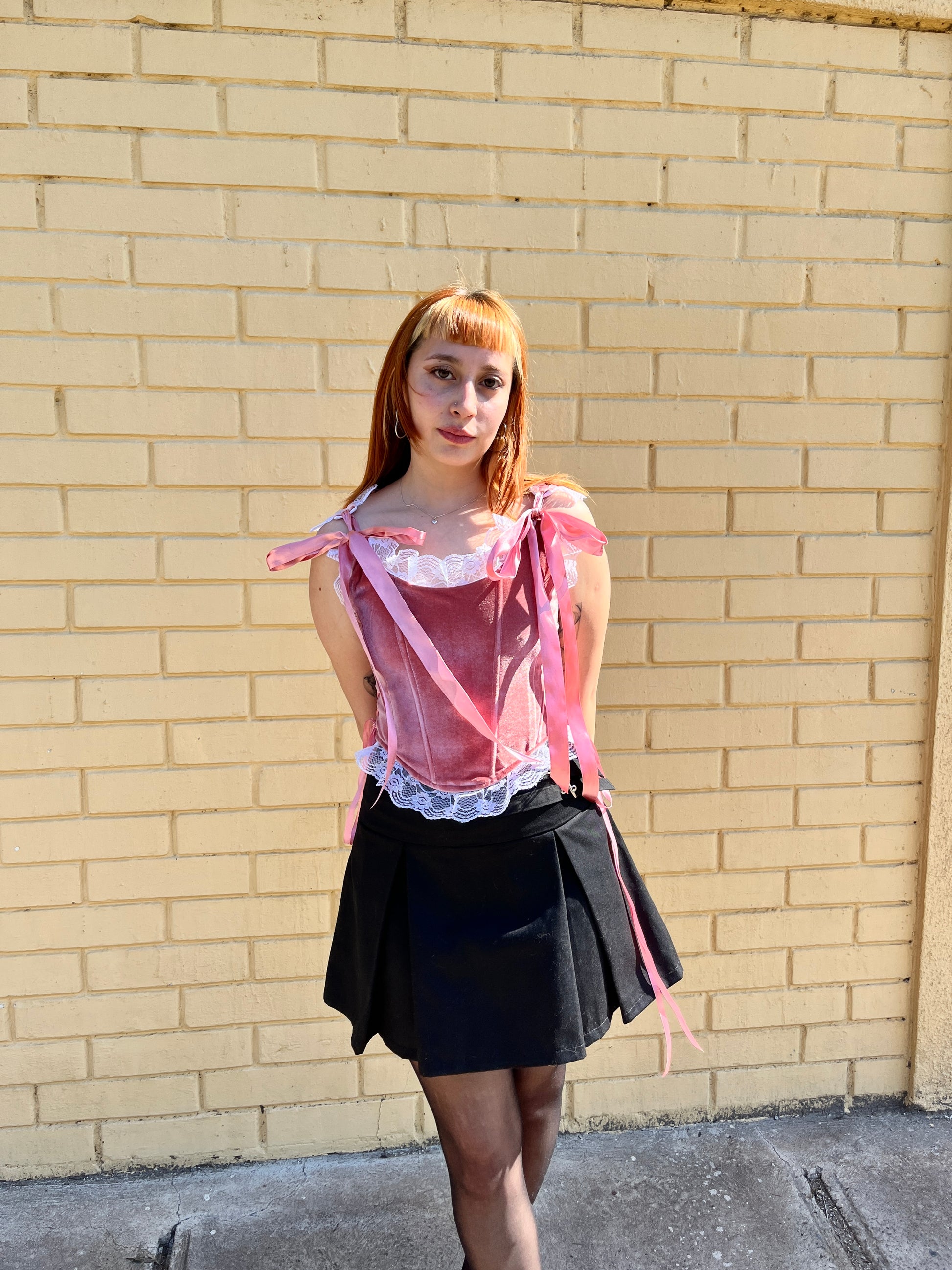 El Corset Valerie Rosado. posee ojetillos en su ambos costados que se unen junto con cinta rosado de satin, al igual que en sus hombros, lleva detalle de encaje en busto, tirantes y parte de abajo.