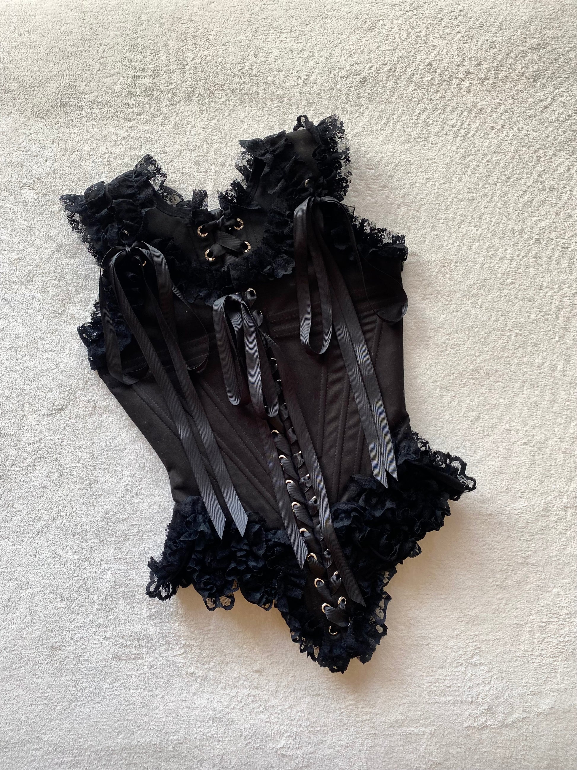 El Corset Victoriano Negro, posee ojetillos en su parte de adelante y en espalda que se unen junto con cinta negra de satin, al igual que en sus hombros. Este modelo llega a la cadera.