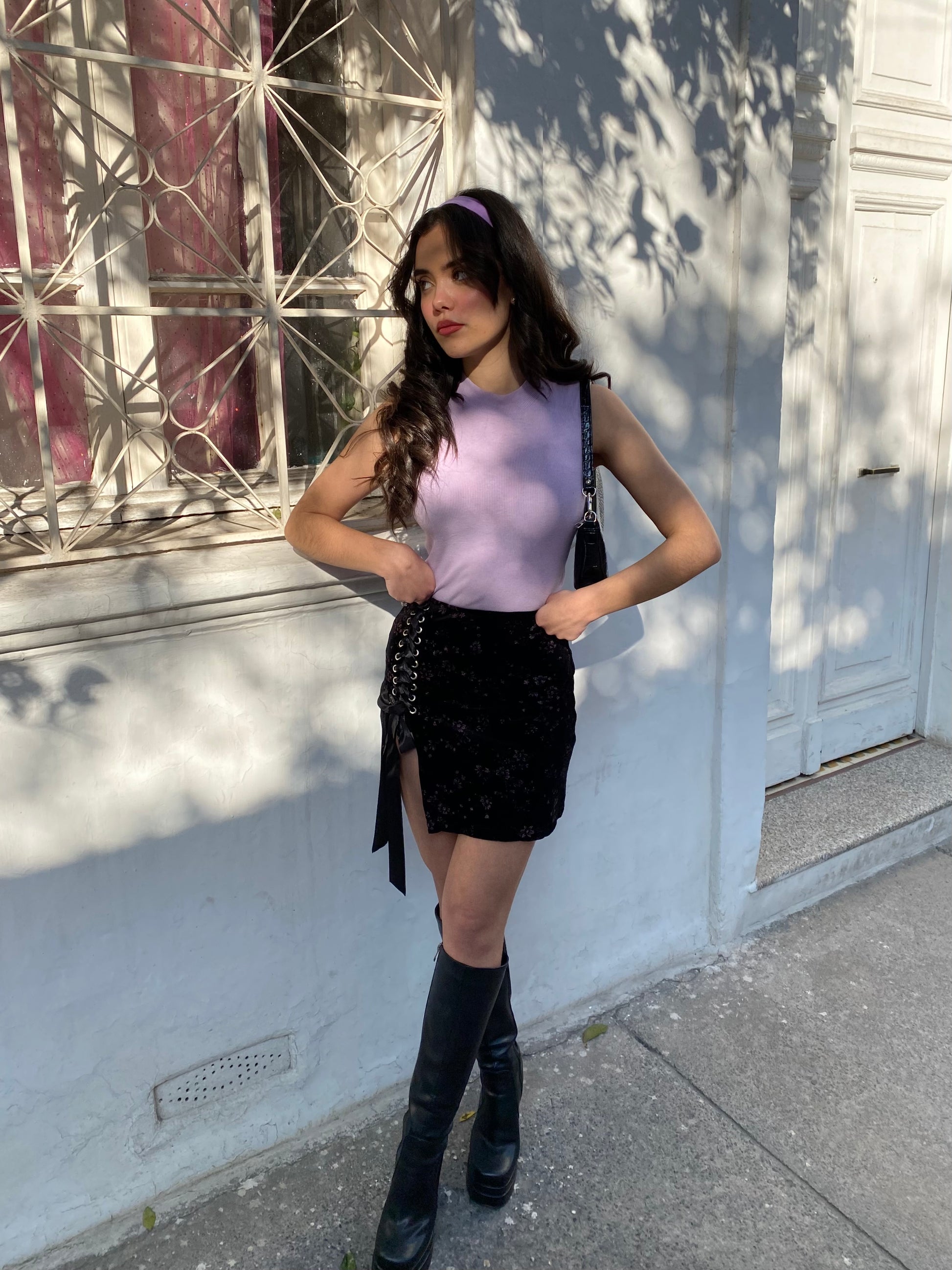 La Falda Twice Negra Flores Brillos posee ojetillos y cinta de satin negra en un costado, dejando una apertura a mitad de pierna.