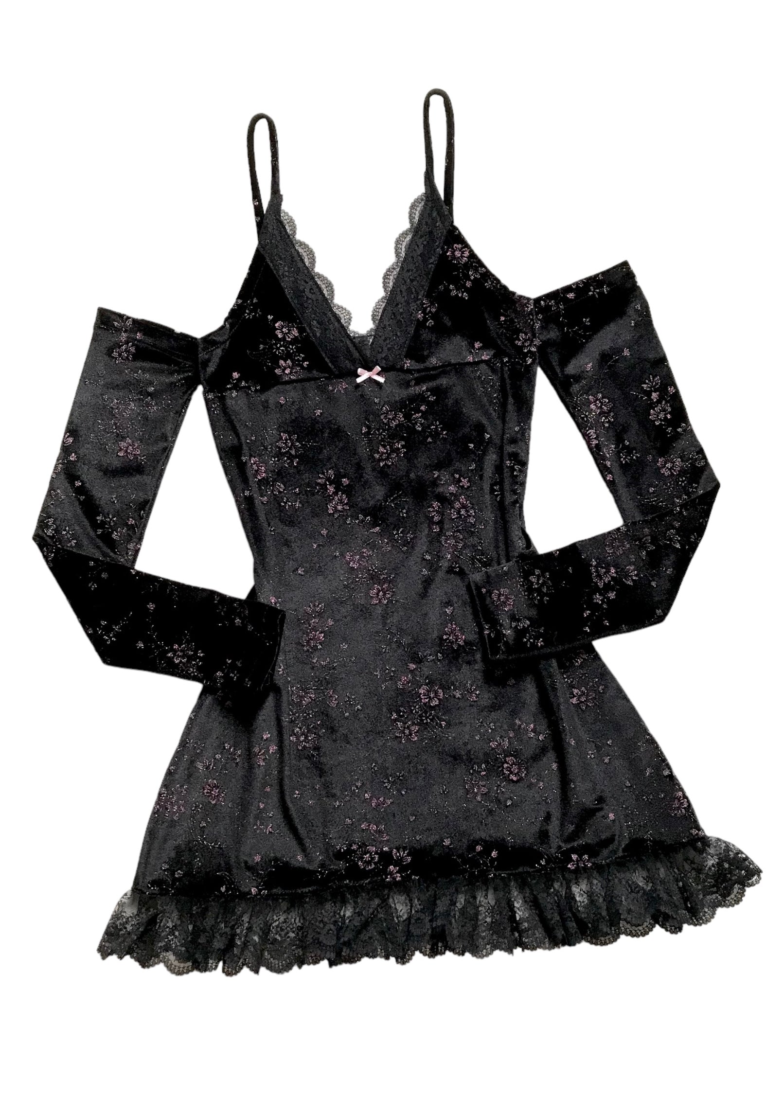 Version manga larga de nuestro Vestido Débora Negro Flores Brillos. Posee tirantes con detalles de encaje negro en el escote y en la parte de inferior.